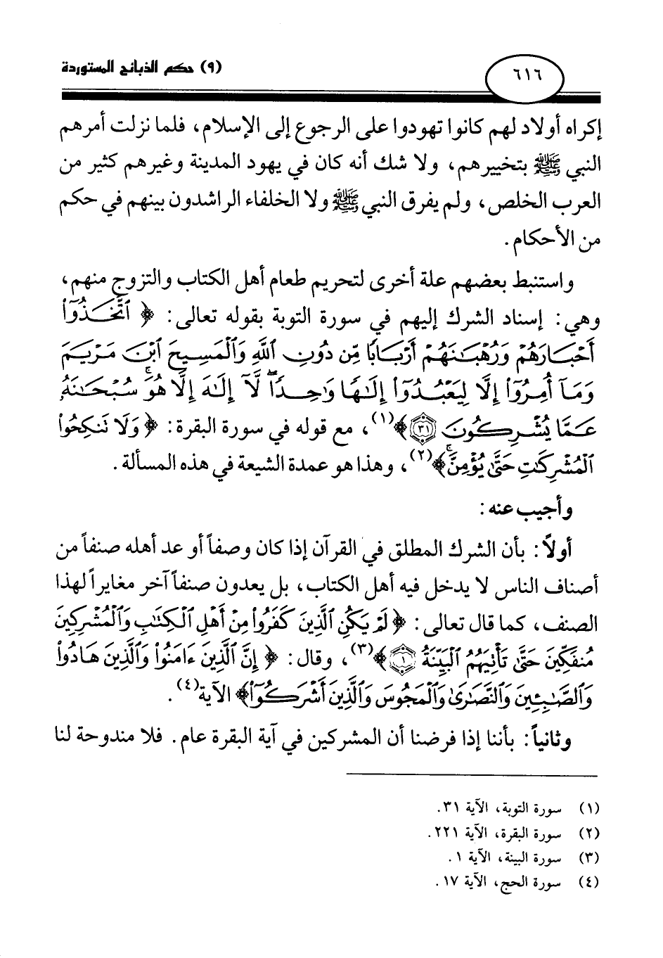 واستنبط بعضهم علة أخرى لتحريم طعام أهل الكتاب والتزوج منهم، وهي: إسناد الشرك إليهم في سورة التوبة بقوله تعالى: {اتَّخَذُوا أَحْبَارَهُمْ وَرُهْبَانَهُمْ أَرْبَابًا مِنْ دُونِ اللَّهِ وَالْمَسِيحَ ابْنَ مَرْيَمَ وَمَا أُمِرُوا إِلَّا لِيَعْبُدُوا إِلَهًا وَاحِدًا لَا إِلَهَ إِلَّا هُوَ سُبْحَانَهُ عَمَّا يُشْرِكُونَ} (¬1) مع قوله في سورة البقرة: {وَلَا تَنْكِحُوا الْمُشْرِكَاتِ حَتَّى يُؤْمِنَّ} (¬2) وهذا هو عمدة الشيعة في هذه المسألة.