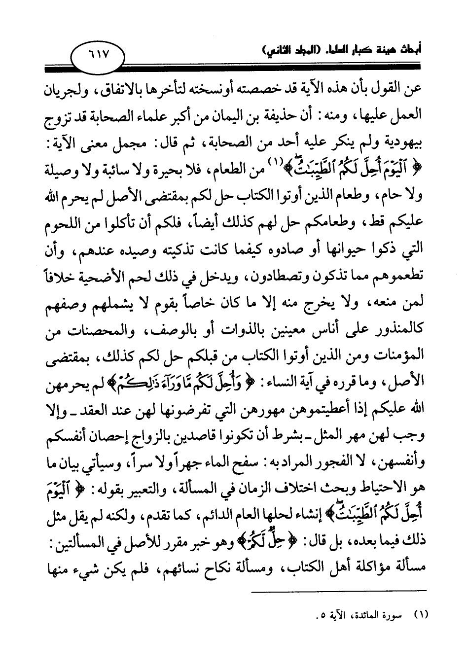 عن القول بأن هذه الآية قد خصصته أو نسخته لتأخرها بالاتفاق ولجريان العمل عليها، ومنه: أن حذيفة بن اليمان من أكبر علماء الصحابة قد تزوج بيهودية ولم ينكر عليه أحد من الصحابة، ثم قال: مجمل معنى الآية: {الْيَوْمَ أُحِلَّ لَكُمُ الطَّيِّبَاتُ} (¬1) من الطعام، فلا بحيرة ولا سائبة ولا وصيلة ولا حام، وطعام الذين أوتوا الكتاب حل لكم بمقتضى الأصل لم يحرم الله عليكم قط، وطعامكم حل لهم كذلك أيضا، فلكم أن تأكلوا من اللحوم التي ذكوا حيوانها أو صادوه كيفما كانت تذكيته وصيده عندهم، وأن تطعموهم مما تذكون وتصطادون، ويدخل في ذلك لحم الأضحية خلافا لمن منعه، ولا يخرج منه إلا ما كان خاصا بقوم لا يشملهم وصفهم كالمنذور على أناس معينين بالذوات أو بالوصف، والمحصنات من المؤمنات ومن الذين أوتوا الكتاب من قبلكم حل لكم كذلك، بمقتضى الأصل، وما قرره في آية النساء: {وَأُحِلَّ لَكُمْ مَا وَرَاءَ ذَلِكُمْ} (¬2) لم يحرمهن الله عليكم إذا أعطيتموهن مهورهن التي تفرضونها لهن عند العقد - وإلا وجب لهن مهر المثل - بشرط أن تكونوا قاصدين بالزواج إحصان أنفسكم وأنفسهن، لا الفجور المراد به: سفح الماء جهرا ولا سرا، وسيأتي بيان ما هو الاحتياط وبحث اختلاف الزمان في المسألة، والتعبير بقوله: {الْيَوْمَ أُحِلَّ لَكُمُ الطَّيِّبَاتُ} (¬3) إنشاء لحلها العام الدائم، كما تقدم، ولكنه لم يقل مثل ذلك فيما بعده، بل قال: {حِلٌّ لَكُمْ} (¬4) وهو خبر مقرر للأصل في المسألتين: مسألة مواكلة أهل الكتاب، ومسألة نكاح نسائهم، فلم يكن شيء منها