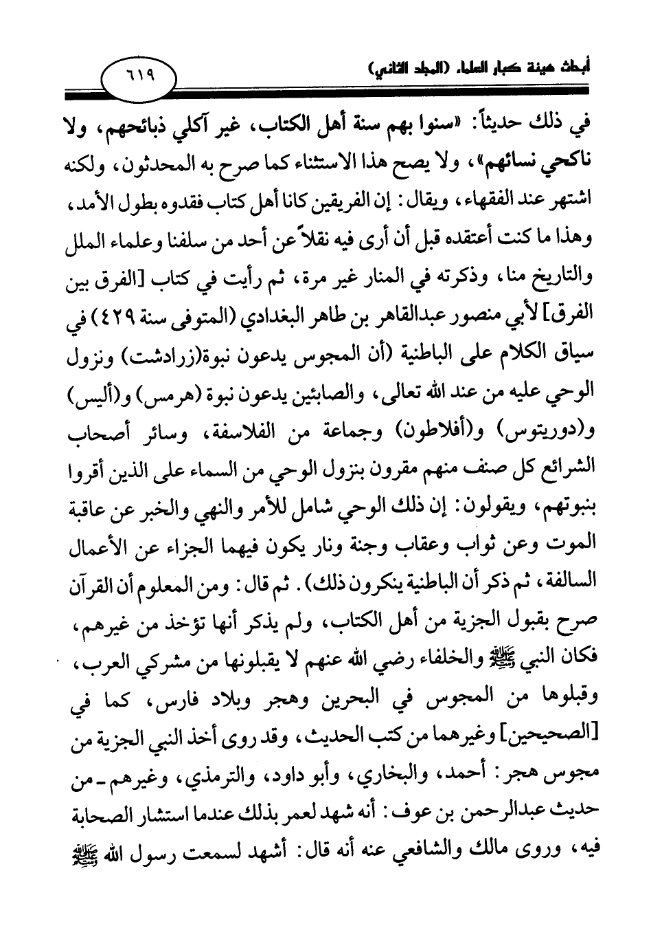 في ذلك حديثا: «سنوا بهم سنة أهل الكتاب، غير آكلي ذبائحهم، ولا ناكحي نسائهم (¬1) » ، ولا يصح هذا الاستثناء كما صرح به المحدثون، ولكنه اشتهر عند الفقهاء، ويقال: إن الفريقين كانا أهل كتاب فقدوه بطول الأمد، وهذا ما كنت أعتقده قبل أن أرى فيه نقلا عن أحد من سلفنا وعلماء الملل والتاريخ منا، وذكرته في المنار غير مرة، ثم رأيت في كتاب [الفرق بين الفرق] لأبي منصور عبد القاهر بن طاهر البغدادي (المتوفى سنة 429) في سياق الكلام على الباطنية (أن المجوس يدعون نبوة (زرادشت) ونزول الوحي عليه من عند الله تعالى، والصابئين يدعون نبوة (هرمس) و (أليس) و (دوريتوس) و (أفلاطون) وجماعة من الفلاسفة، وسائر أصحاب الشرائع كل صنف منهم مقرون بنزول الوحي من السماء على الذين أقروا بنبوتهم، ويقولون: (إن ذلك الوحي شامل للأمر والنهي والخبر عن عاقبة الموت وعن ثواب وعقاب وجنة ونار يكون فيهما الجزاء عن الأعمال السالفة، ثم ذكر أن الباطنية ينكرون ذلك) . ثم قال: ومن المعلوم أن القرآن صرح بقبول الجزية من أهل الكتاب، ولم يذكر أنها تؤخذ من غيرهم، فكان النبي صلى الله عليه وسلم والخلفاء رضي الله عنهم لا يقبلونها من مشركي العرب، وقبلوها من المجوس في البحرين وهجر وبلاد فارس، كما في [الصحيحين] وغيرهما من كتب الحديث، وقد روى أخذ النبي الجزية من مجوس هجر: أحمد، والبخاري، وأبو داود، والترمذي، وغيرهم - من حديث عبد الرحمن بن عوف: أنه شهد لعمر بذلك عندما استشار الصحابة فيه، وروى مالك والشافعي عنه أنه قال: أشهد لسمعت رسول الله صلى الله عليه وسلم