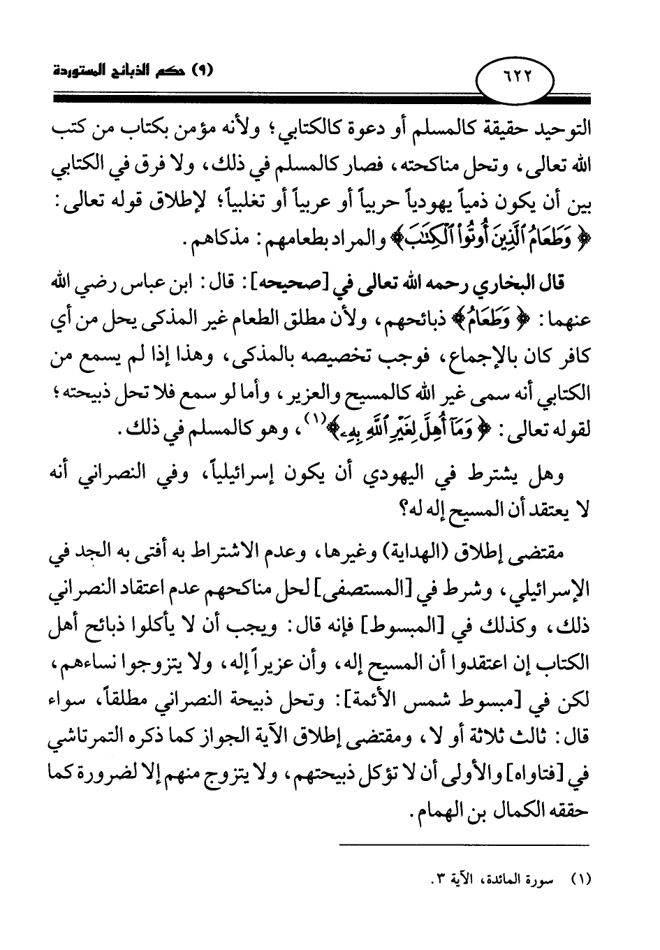 قال البخاري رحمه الله تعالى في [صحيحه] : قال: ابن عباس رضي الله عنهما: وطعام ذبائحهم، ولأن مطلق الطعام غير المذكى يحل من أي كافر كان بالإجماع، فوجب تخصيصه بالمذكى، وهذا لم يسمع من الكتابي أنه سمى غير الله كالمسيح والعزيز، وأما لو سمع فلا تحل ذبيحته؛ لقوله تعالى: {وَمَا أُهِلَّ لِغَيْرِ اللَّهِ بِهِ} (¬2) وهو كالمسلم في ذلك.