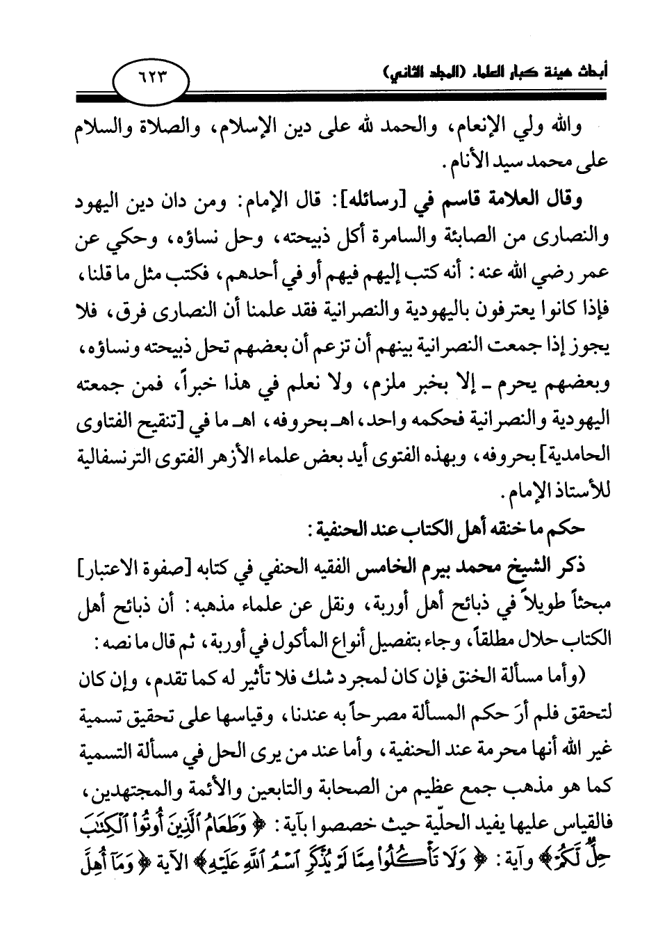 وقال العلامة قاسم في [رسائله] : قال الإمام: ومن دان دين اليهود والنصارى من الصابئة والسامرة أكل ذبيحته، وحل نساؤه، وحكي عن عمر رضي الله عنه: أنه كتب إليهم فيهم أو في أحدهم، فكتب مثل ما قلنا، فإذا كانوا يعترفون باليهودية والنصرانية فقد علمنا أن النصارى فرق، فلا يجوز إذا اجتمعت النصرانية بينهم أن تزعم أن بعضهم تحل ذبيحته ونساؤه، وبعضهم يحرم - إلا بخبر ملزم، ولا نعلم في هذا خبرا، فمن جمعته اليهودية والنصرانية فحكمه واحد، اهـ بحروفه، اهـ ما في [تنقيح الفتاوى الحامدية] بحروفه، وبهذه الفتوى أيد بعض علماء الأزهر الفتوى الترنسفالية للأستاذ الإمام.