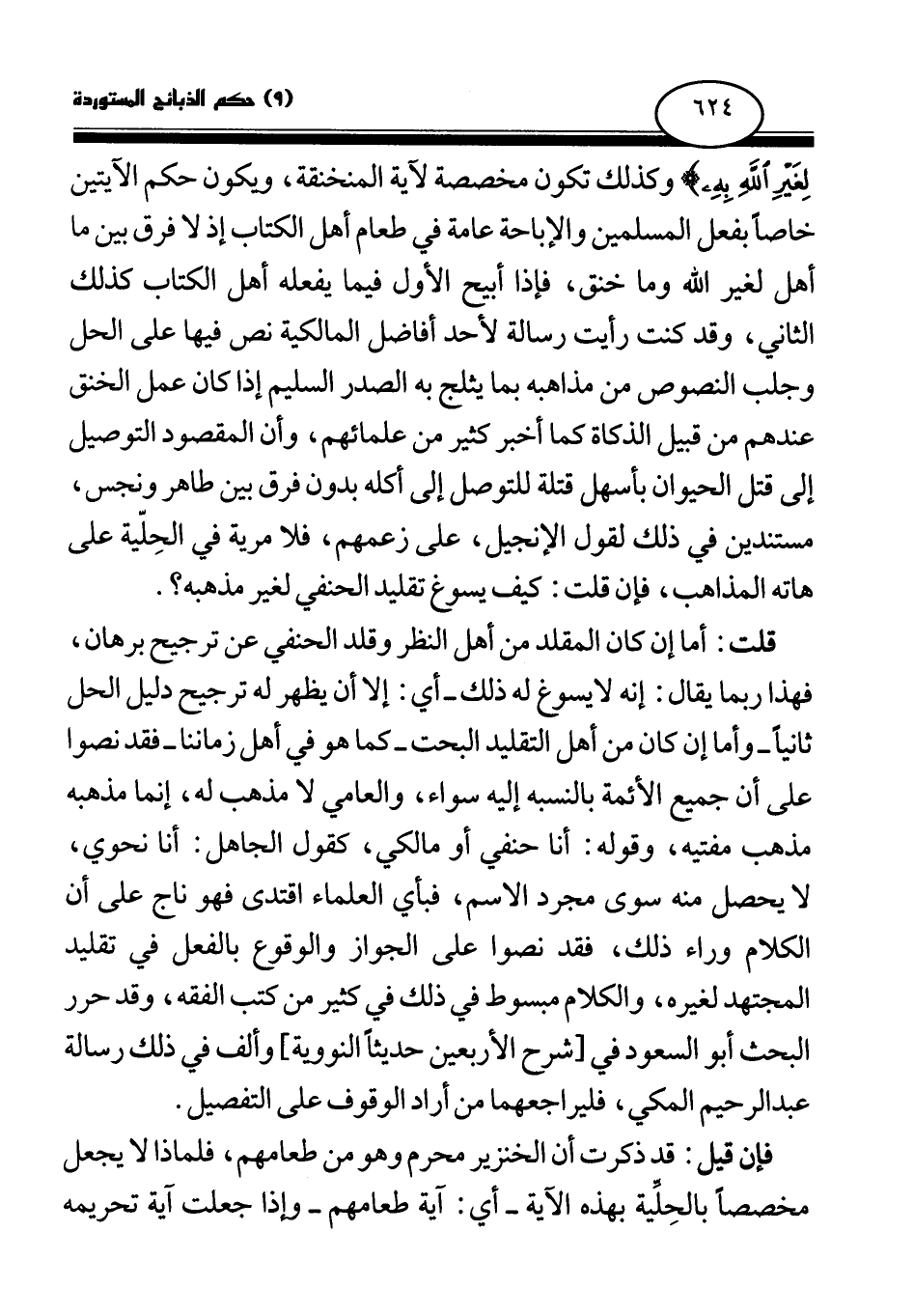 {وَمَا أُهِلَّ لِغَيْرِ اللَّهِ بِهِ} (¬1) وكذلك تكون مخصصة لآية المنخنقة، ويكون حكم الآيتين خاصا بفعل المسلمين والإباحة في طعام أهل الكتاب إذ لا فرق بين ما أهل لغير الله وما خنق، فإذا أبيح الأول فيما يفعله أهل الكتاب كذلك الثاني، وقد كنت رأيت رسالة لأحد أفاضل المالكية نص فيها على الحل وجلب النصوص من مذاهبه بما يثلج به الصدر السليم إذا كان عمل الخنق عندهم من قبيل الذكاة كما أخبر كثير من علمائهم، وأن المقصود التوصيل إلى قتل الحيوان بأسهل قتلة للتوصل إلى أكله بدون فرق بين طاهر ونجس، مستندين في ذلك لقول الإنجيل، على زعمهم، فلا مرية في الحلية على هاته المذاهب، فإن قلت: كيف يسوغ تقليد الحنفي لغير مذهبه؟