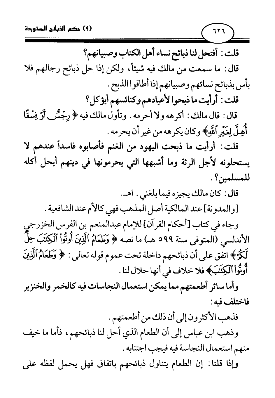 وجاء في كتاب [أحكام القرآن] للإمام عبد المنعم بن الفرس الخرزجي الأندلسي (المتوفى سنة 599 هـ) ما نصه {وَطَعَامُ الَّذِينَ أُوتُوا الْكِتَابَ حِلٌّ لَكُمْ} (¬2) فلا خلاف في أنها حلال لنا.