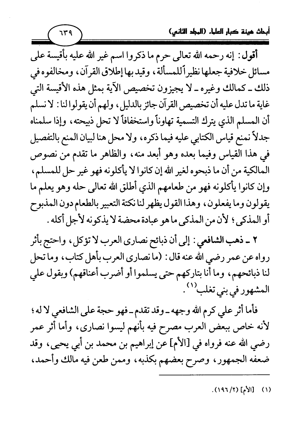 2 - ذهب الشافعي: إلى أن ذبائح نصارى العرب لا تؤكل، واحتج بأثر رواه عن عمر رضي الله عنه قال: (ما نصارى العرب بأهل كتاب، وما تحل لنا ذبائحهم، وما أنا بتاركهم حتى يسلموا أو أضرب أعناقهم) وبقول علي المشهور في بني تغلب (¬1) .