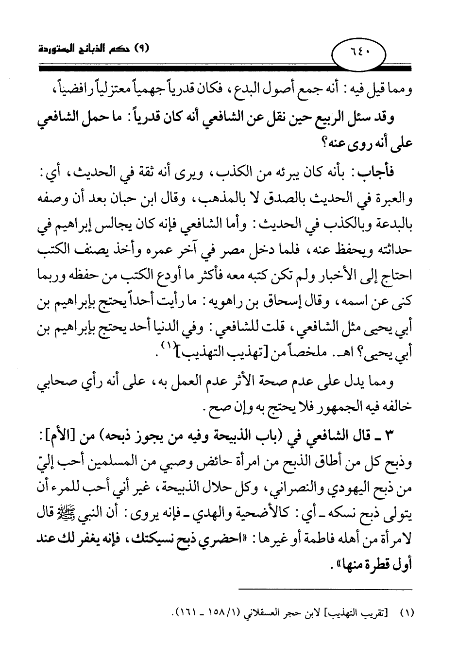 فأجاب: بأنه كان يبرئه من الكذب، ويرى أنه ثقة في الحديث، أي: والعبرة في الحديث بالصدق لا بالمذهب، وقال ابن حبان بعد أن وصفه بالبدعة وبالكذب في الحديث: وأما الشافعي فإنه كان يجالس إبراهيم في حداثته ويحفظ عنه، فلما دخل مصر في آخر عمره وأخذ يصنف الكتب احتاج إلى الأخبار ولم تكن كتبه معه فأكثر ما أودع الكتب من حفظه وربما كنى عن اسمه، وقال إسحاق بن راهويه: ما رأيت أحد يحتج بإبراهيم بن أبي يحيى مثل الشافعي، قلت للشافعي: وفي الدنيا أحد يحتج بإبراهيم بن أبي يحيى؟ اهـ. ملخصا من [تهذيب التهذيب] (¬1) .