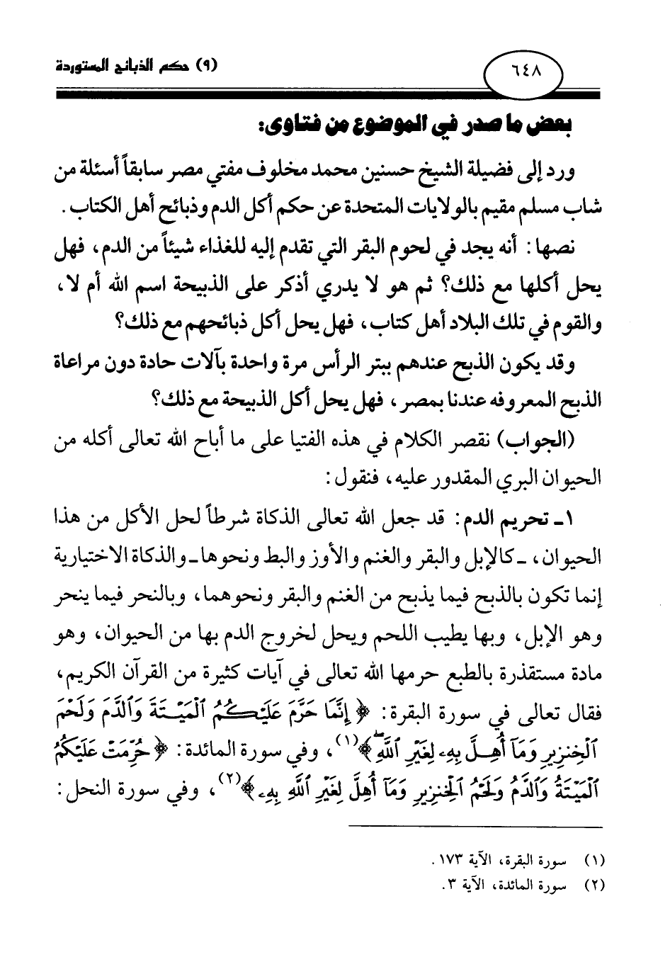 ورد إلى فضيلة الشيخ حسنين محمد مخلوف مفتي مصر سابقا أسئلة من شاب مسلم مقيم بالولايات المتحدة عن حكم أكل الدم وذبائح أهل الكتاب.