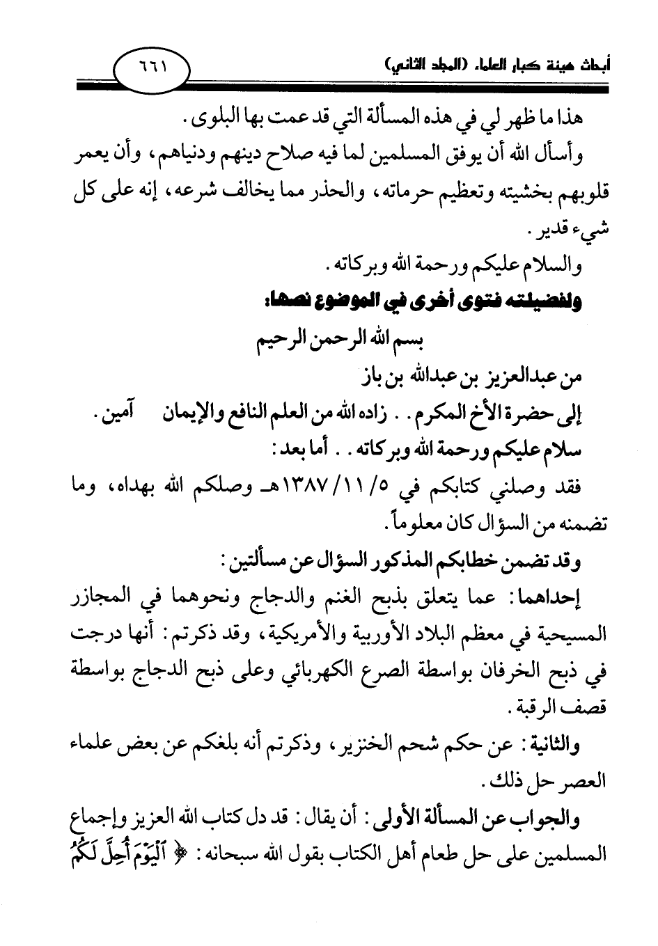 فقد وصلني كتابكم في 5 / 11 / 1387 هـ وصلكم الله بهداه، وما تضمنه من السؤال كان معلوما.
