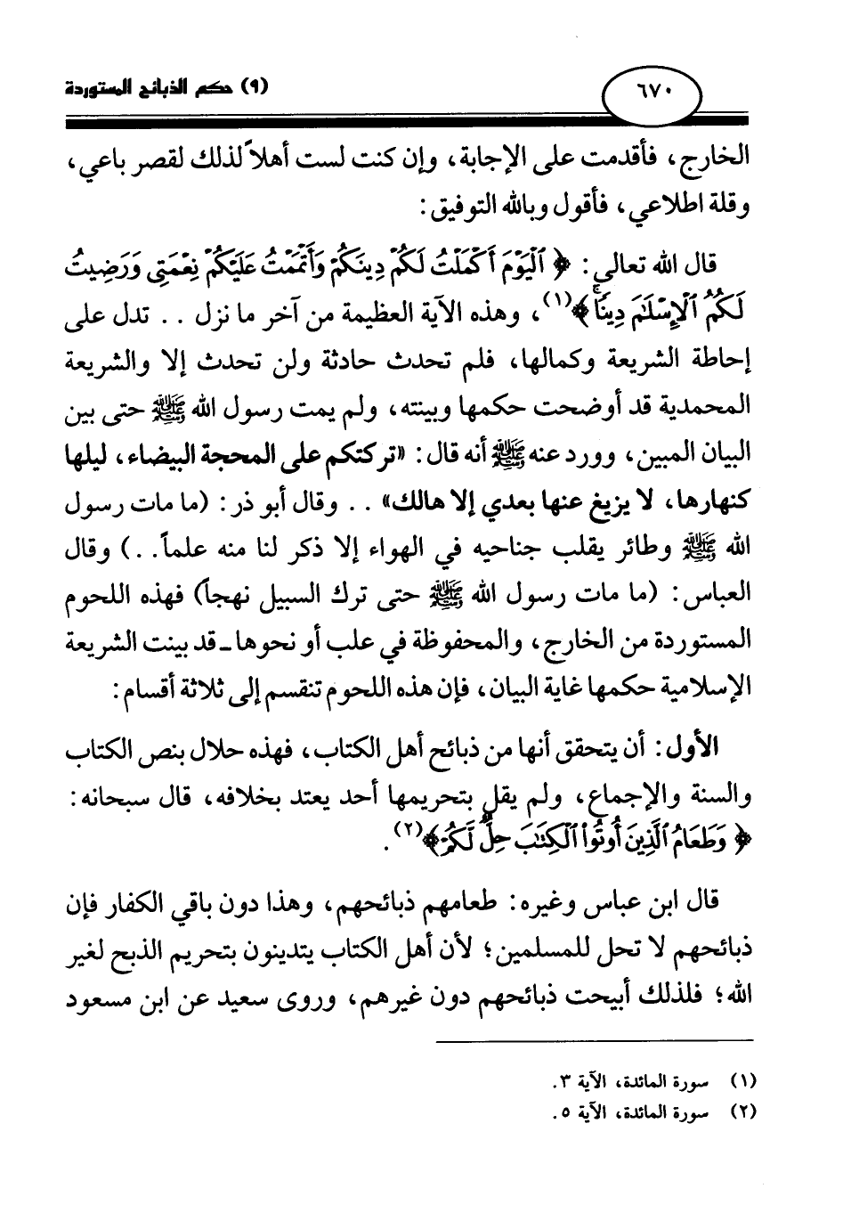 قال الله تعالى: {الْيَوْمَ أَكْمَلْتُ لَكُمْ دِينَكُمْ وَأَتْمَمْتُ عَلَيْكُمْ نِعْمَتِي وَرَضِيتُ لَكُمُ الْإِسْلَامَ دِينًا} (¬1) وهذه الآية العظيمة من آخر ما نزل. . تدل على إحاطة الشريعة وكمالها، فلم تحدث حادثة ولن تحدث إلا والشريعة المحمدية قد أوضحت حكمها وبينته، ولم يمت رسول الله صلى الله عليه وسلم حتى بين البيان المبين، وورد عنه صلى الله عليه وسلم أنه قال: «تركتكم على المحجة البيضاء، ليلها كنهارها، لا يزيغ عنها بعدي إلا هالك (¬2) » . . . وقال أبو ذر: (ما مات رسول الله صلى الله عليه وسلم وطائر يقلب جناحيه في الهواء إلا ذكر لنا منه علما. . .) وقال العباس: (ما مات رسول الله صلى الله عليه وسلم حتى ترك السبيل نهجا) فهذه اللحوم المستوردة من الخارج، والمحفوظة في علب أو نحوها قد بينت الشريعة الإسلامية حكمها غاية البيان، فإن اللحوم تنقسم إلى ثلاثة أقسام: