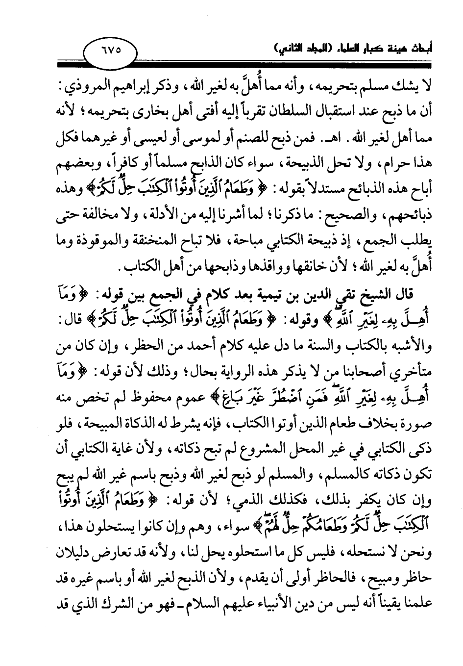 قال الشيخ تقي الدين بن تيمية بعد كلام في الجمع بين قوله: {وَمَا أُهِلَّ بِهِ لِغَيْرِ اللَّهِ} (¬2) وقوله: {وَطَعَامُ الَّذِينَ أُوتُوا الْكِتَابَ حِلٌّ لَكُمْ} (¬3) قال: والأشبه بالكتاب والسنة ما دل عليه كلام أحمد من الحظر، وإن كان من متأخري أصحابنا من لا يذكر هذه الرواية بحال؛ وذلك لأن قوله: {وَمَا أُهِلَّ بِهِ لِغَيْرِ اللَّهِ فَمَنِ اضْطُرَّ غَيْرَ بَاغٍ} (¬4) عموم محفوظ لم تخص منه صورة بخلاف طعام الذين أوتوا الكتاب، فإنه يشرط له الذكاة المبيحة، فلو ذكى الكتابي في غير المحل المشروع لم تبح ذكاته، ولأن غاية الكتابي أن تكون ذكاته كالمسلم، والمسلم لو ذبح لغير الله وذبح باسم غير الله لم يبح وإن كان يكفر بذلك، فكذلك الذمي؛ لأن قوله: {وَطَعَامُ الَّذِينَ أُوتُوا الْكِتَابَ حِلٌّ لَكُمْ وَطَعَامُكُمْ حِلٌّ لَهُمْ} (¬5) سواء، وهم وإن كانوا يستحلون هذا، ونحن لا نستحله، فليس كل ما استحلوه يحل لنا، ولأنه قد تعارض دليلان حاظر ومبيح، فالحاظر أولى أن يقدم، ولأن الذبح لغير الله أو باسم غيره قد علمنا يقينا أنه ليس من دين الأنبياء عليهم السلام - فهو من الشرك الذي قد