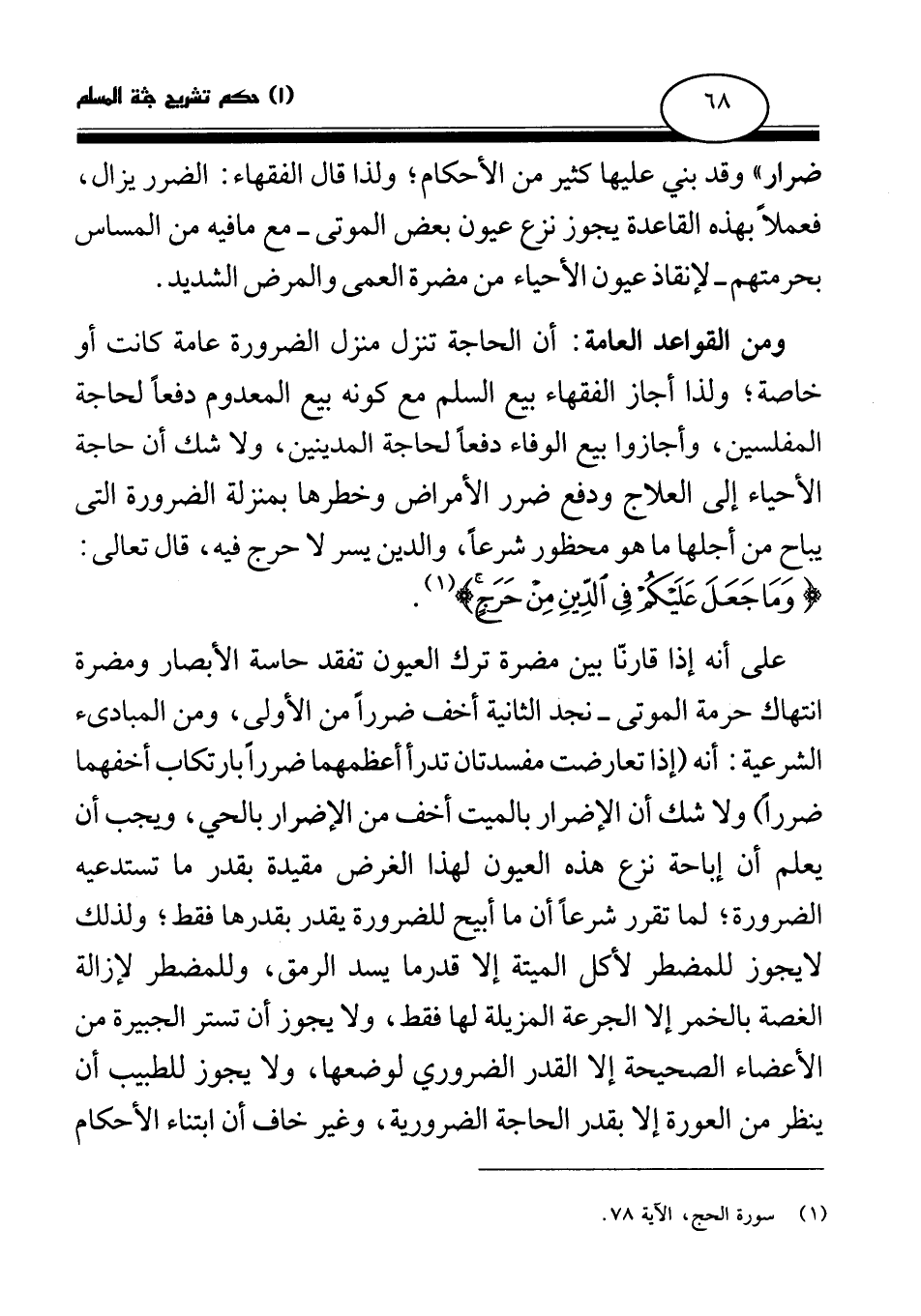 ومن القواعد العامة: أن الحاجة تنزل منزل الضرورة عامة كانت أو خاصة؛ ولذا أجاز الفقهاء بيع السلم مع كونه بيع المعدوم دفعا لحاجة المفلسين، وأجازوا بيع الوفاء دفعا لحاجة المدينين، ولا شك أن حاجة الأحياء إلى العلاج ودفع ضرر الأمراض وخطرها بمنزلة الضرورة التي يباح من أجلها ما هو محظور شرعا، والدين يسر لا حرج فيه، قال تعالى: {وَمَا جَعَلَ عَلَيْكُمْ فِي الدِّينِ مِنْ حَرَجٍ} (¬2)