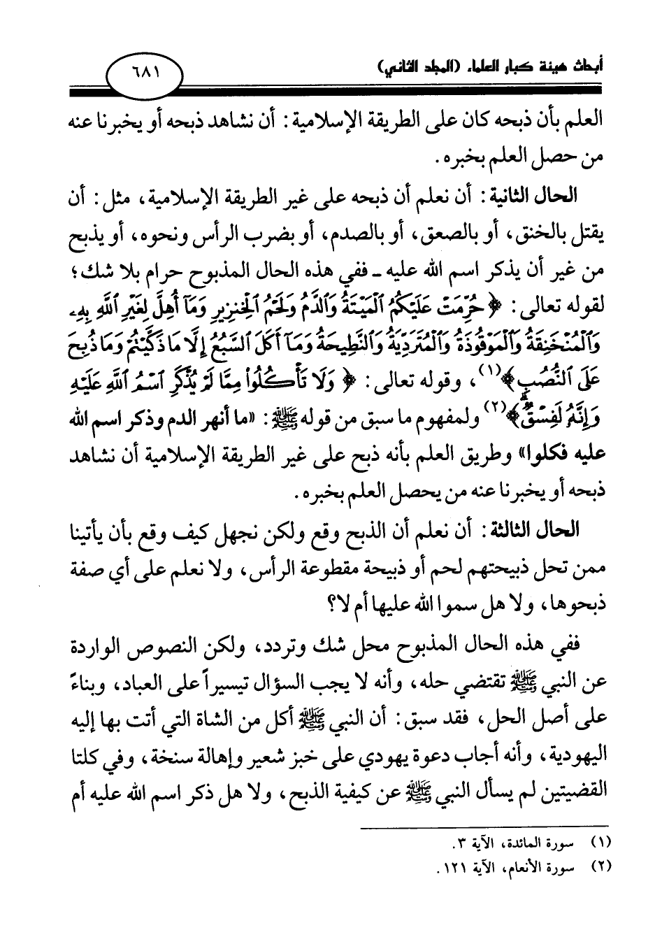 الحال الثانية: أن نعلم أن ذبحه على غير الطريقة الإسلامية، مثل: أن يقتل بالخنق، أو بالصعق، أو بالصدم، أو يضرب الرأس ونحوه، أو يذبح من غير أن يذكر اسم الله عليه - ففي هذه الحال المذبوح حرام بلا شك؛ لقوله تعالى: {حُرِّمَتْ عَلَيْكُمُ الْمَيْتَةُ وَالدَّمُ وَلَحْمُ الْخِنْزِيرِ وَمَا أُهِلَّ لِغَيْرِ اللَّهِ بِهِ وَالْمُنْخَنِقَةُ وَالْمَوْقُوذَةُ وَالْمُتَرَدِّيَةُ وَالنَّطِيحَةُ وَمَا أَكَلَ السَّبُعُ إِلَّا مَا ذَكَّيْتُمْ وَمَا ذُبِحَ عَلَى النُّصُبِ} (¬1) وقوله تعالى: {وَلَا تَأْكُلُوا مِمَّا لَمْ يُذْكَرِ اسْمُ اللَّهِ عَلَيْهِ وَإِنَّهُ لَفِسْقٌ} (¬2) ولمفهوم ما سبق من قوله - صلى الله عليه وسلم -: «ما أنهر الدم وذكر اسم الله عليه فكلوا (¬3) » وطريق العلم بأنه ذبح على غير الطريقة الإسلامية أن نشاهد ذبحه أو يخبرنا عنه من يحصل العلم بخبره.