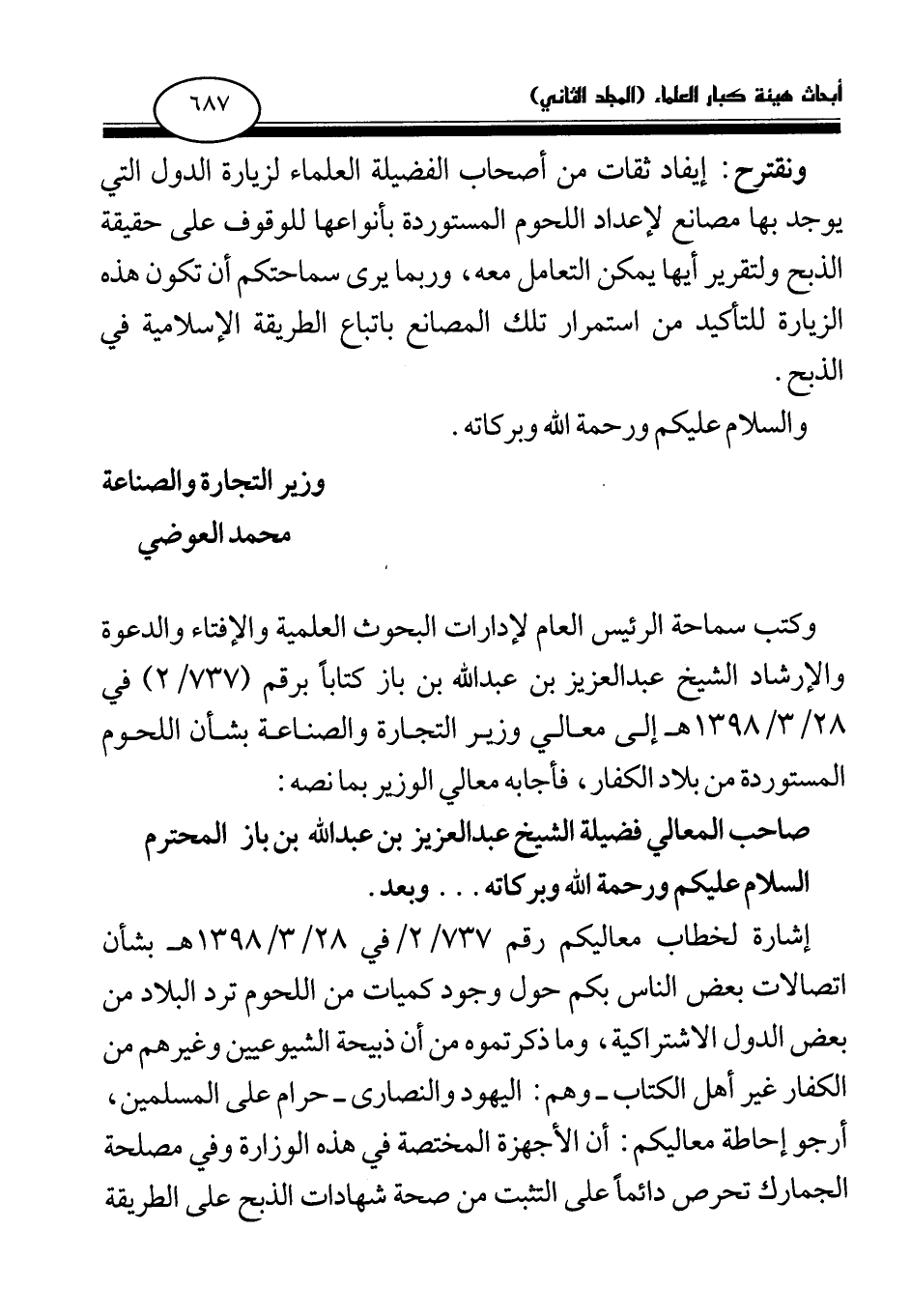 وكتب سماحة الرئيس العام لإدارات البحوث العلمية والإفتاء والدعوة والإرشاد الشيخ عبد العزيز بن عبد الله بن باز كتابا برقم (737\2) في 28\3\1398هـ إلى معالي وزير التجارة والصناعة بشأن اللحوم المستوردة من بلاد الكفار، فأجابه معالي الوزير بما نصه: