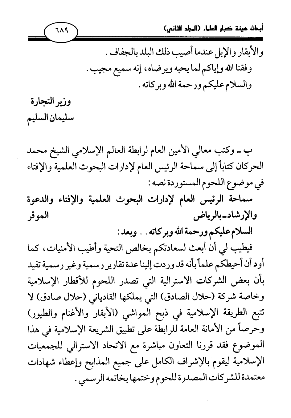 ب- وكتب معالي الأمين العام لرابطة العالم الإسلامي الشيخ محمد الحركان كتابا إلى سماحة الرئيس العام لإدارات البحوث العلمية والإفتاء في موضوع اللحوم المستوردة نصه: