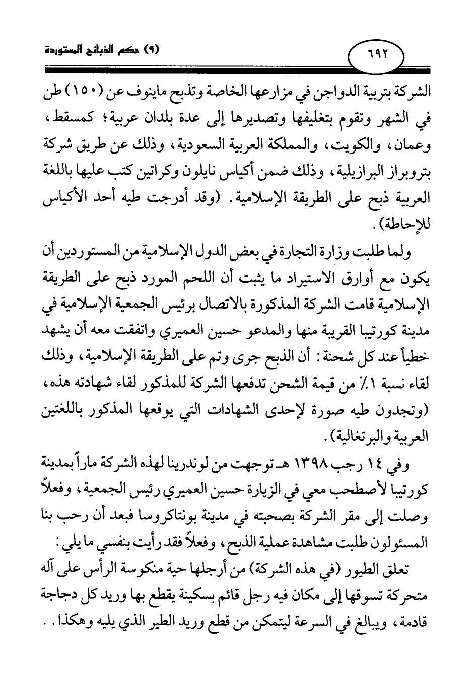 ولما طلبت وزارة التجارة في بعض الدول الإسلامية من المستوردين أن يكون مع أوراق الاستيراد ما يثبت أن اللحم المورد ذبح على الطريقة الإسلامية قامت الشركة المذكورة بالاتصال برئيس الجمعية الإسلامية في مدينة كورتيبا القريبة منها والمدعو حسين العميري واتفقت معه أن يشهد خطيا عند كل شحنة: أن الذبح جرى وتم على الطريقة الإسلامية، وذلك لقاء نسبة 1% من قيمة الشحن تدفعها الشركة للمذكور لقاء شهادته هذه، (وتجدون طيه صورة لإحدى الشهادات التي يوقعها المذكور باللغتين العربية والبرتغالية) .