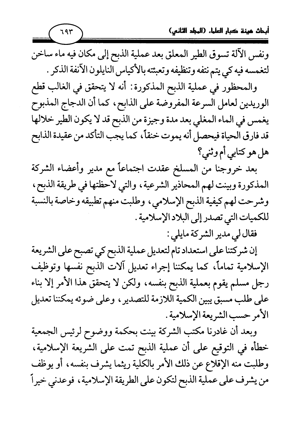 بعد خروجنا من المسلخ عقدت اجتماعا مع مدير وأعضاء الشركة المذكورة وبينت لهم المحاذير الشرعية، والتي لاحظتها في طريقة الذبح، وشرحت لهم كيفية الذبح الإسلامي، وطلبت منهم تطبيقه وخاصة بالنسبة للكميات التي تصدر إلى البلاد الإسلامية.