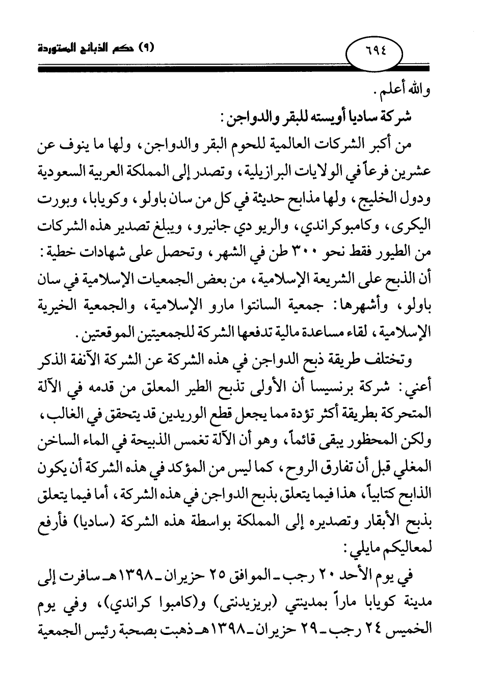 وتختلف طريقة ذبح الدواجن في هذه الشركة عن الشركة الآنفة الذكر أعني: شركة برنسيسا أن الأولى تذبح الطير المعلق من قدمه في الآلة المتحركة بطريقة أكثر تؤدة مما يجعل قطع الوريدين قد يتحقق في الغالب، ولكن المحظور يبقى قائما، وهو أن الآلة تغمس الذبيحة في الماء الساخن المغلي قبل أن تفارق الروح، كما ليس من المؤكد في هذه الشركة أن يكون الذابح كتابيا، هذا فيما يتعلق بذبح الدواجن في هذه الشركة، أما فيما يتعلق بذبح الأبقار وتصديره إلى المملكة بواسطة هذه الشركة (ساديا) فأرفع لمعاليكم ما يلي:
