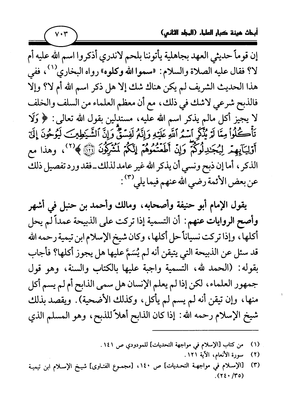 إن قوما حديثي العهد بجاهلية يأتوننا بلحم لا ندري أذكروا اسم الله عليه أم لا؟ فقال - عليه الصلاة والسلام -: سموا الله وكلوه (¬1) » رواه البخاري (¬2) ، ففي هذا الحديث الشريف لم يكن هناك شك إلا هل ذكر اسم الله أم لا؟ وإلا فالذبح شرعي لا شك في ذلك، مع أن معظم العلماء من السلف والخلف لا يجيز أكل ما لم يذكر اسم الله عليه، مستدلين بقول الله تعالى: {وَلَا تَأْكُلُوا مِمَّا لَمْ يُذْكَرِ اسْمُ اللَّهِ عَلَيْهِ وَإِنَّهُ لَفِسْقٌ وَإِنَّ الشَّيَاطِينَ لَيُوحُونَ إِلَى أَوْلِيَائِهِمْ لِيُجَادِلُوكُمْ وَإِنْ أَطَعْتُمُوهُمْ إِنَّكُمْ لَمُشْرِكُونَ} (¬3) وهذا مع الذكر، أما إن ذبح ونسي أن يذكر الله غير عامد لذلك - فقد ورد تفصيل ذلك عن بعض الأئمة - رضي الله عنهم - فيما يلي (¬4) :