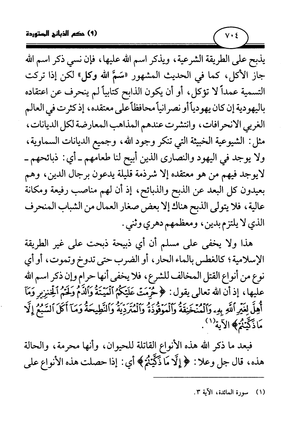 يذبح على الطريقة الشرعية، ويذكر اسم الله عليها، فإن نسي ذكر اسم الله جاز الأكل، كما في الحديث المشهور «سم الله وكل (¬1) » لكن إذا تركت التسمية عمدا لا تؤكل، أو أن يكون الذابح كتابيا لم ينحرف عن اعتقاده باليهودية إن كان يهوديا أو نصرانيا محافظا على معتقده، إذ كثرت في العالم الغربي الانحرافات، وانتشرت عندهم المذاهب المعارضة لكل الديانات، مثل: الشيوعية الخبيثة التي تنكر وجود الله، وجميع الديانات السماوية، ولا يوجد في اليهود والنصارى الذين أبيح لنا طعامهم - أي: ذبائحهم - لا يوجد فيهم من هو معتقده إلا شرذمة قليلة يدعون برجال الدين، وهم بعيدون كل البعد عن الذبح والذبائح، إذ أن لهم مناصب رفيعة ومكانة عالية، فلا يتولى الذبح هناك إلا بعض صغار العمال من الشباب المنحرف الذي لا يلتزم بدين، ومعظمهم دهري وثني.
