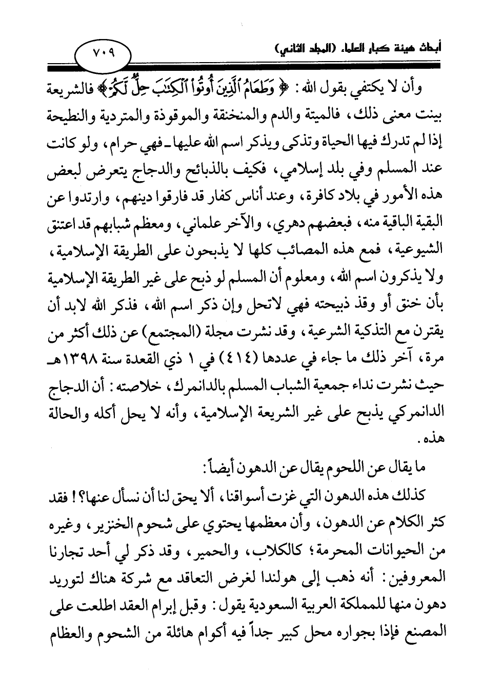 وأن لا يكتفي بقول الله: {وَطَعَامُ الَّذِينَ أُوتُوا الْكِتَابَ حِلٌّ لَكُمْ} (¬1) فالشريعة بينت معنى ذلك، فالميتة والدم والمنخنقة والموقوذة والمتردية والنطيحة إذا لم تدرك فيها الحياة وتذكى ويذكر اسم الله عليها- فهي حرام، ولو كانت عند المسلم وفي بلد إسلامي، فكيف بالذبائح والدجاج يتعرض لبعض هذه الأمور في بلاد كافرة، وعند أناس كفار قد فارقوا دينهم، وارتدوا عن البقية الباقية منه، فبعضهم دهري، والآخر علماني، ومعظم شبابهم قد اعتنق الشيوعية، فمع هذه المصائب كلها لا يذبحون على الطريقة الإسلامية، ولا يذكرون اسم الله، ومعلوم أن المسلم لو ذبح على غير الطريقة الإسلامية بأن خنق أو وقذ ذبيحته فهي لا تحل، وإن ذكر اسم الله، فذكر الله لا بد أن يقترن مع التذكية الشرعية، وقد نشرت مجلة (المجتمع) عن ذلك أكثر من مرة، آخر ذلك ما جاء في عددها (414) في 1 ذي القعدة سنة 1398هـ حيث نشرت نداء جمعية الشباب المسلم بالدانمرك، خلاصته: أن الدجاج الدانمركي يذبح على غير الشريعة الإسلامية، وأنه لا يحل أكله والحالة هذه.