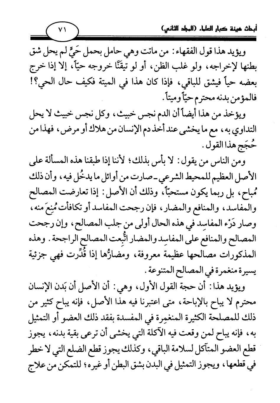 ويؤيد هذا: أن حجة القول الأول، وهي: أن الأصل أن بدن الإنسان محترم لا يباح بالإباحة، متى اعتبرنا فيه هذا الأصل، فإنه يباح كثير من ذلك للمصلحة الكثيرة المنغمرة في المفسدة بفقد ذلك العضو أو التمثيل به، فإنه يباح لمن وقعت فيه الآكلة التي يخشى أن ترعى بقية بدنه، يجوز قطع العضو المتآكل لسلامة الباقي، وكذلك يجوز قطع الضلع التي لا خطر في قطعها، ويجوز التمثيل في البدن بشق البطن أو غيره؛ للتمكن من علاج