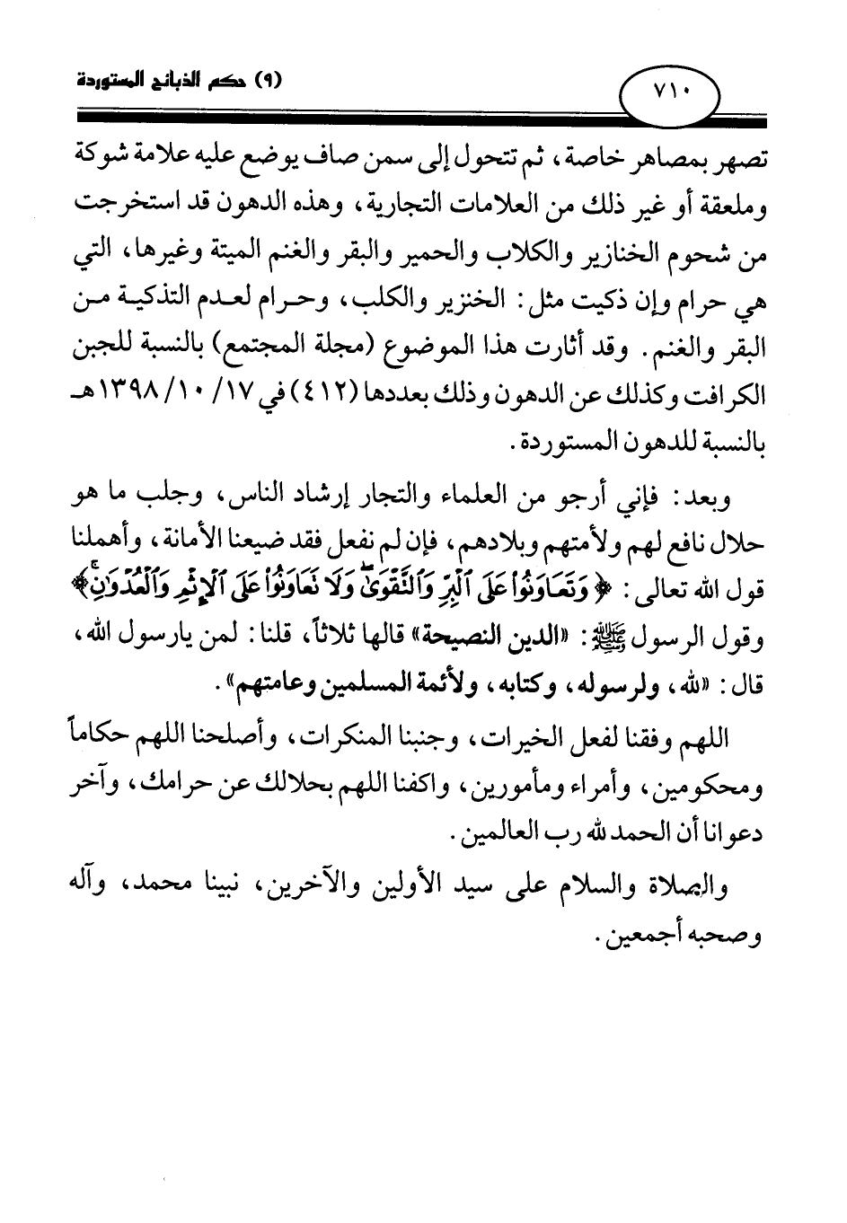 وبعد: فإني أرجو من العلماء والتجار إرشاد الناس، وجلب ما هو حلال نافع لهم ولأمتهم وبلادهم، فإن لم نفعل فقد ضيعنا الأمانة، وأهملنا قول الله تعالى {وَتَعَاوَنُوا عَلَى الْبِرِّ وَالتَّقْوَى وَلَا تَعَاوَنُوا عَلَى الْإِثْمِ وَالْعُدْوَانِ} (¬1) وقول الرسول - صلى الله عليه وسلم -: «الدين النصيحة قالها ثلاثا، قلنا: لمن يا رسول الله، قال: لله، ولرسوله، وكتابه، ولأئمة المسلمين وعامتهم (¬2) » .