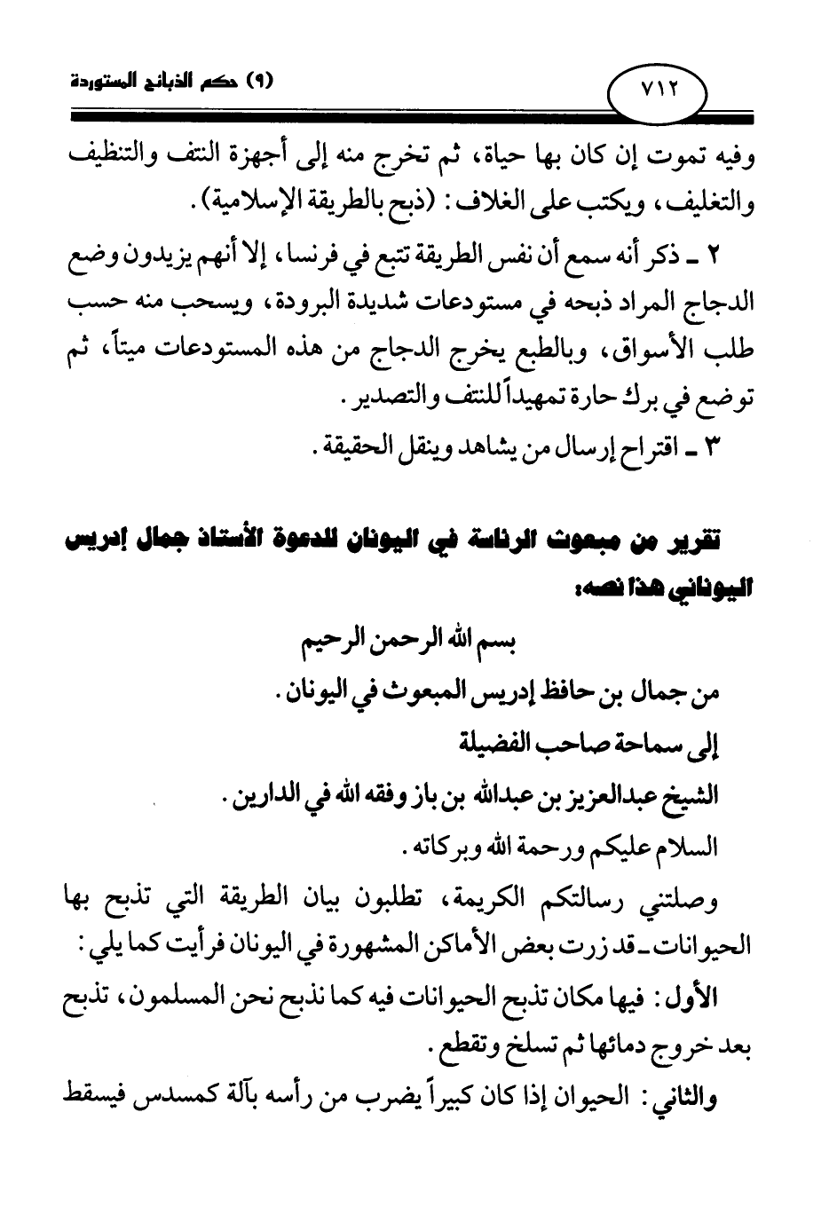 وصلتني رسالتكم الكريمة، تطلبون بيان الطريقة التي تذبح بها الحيوانات- قد زرت بعض الأماكن المشهورة في اليونان فرأيت كما يلي: