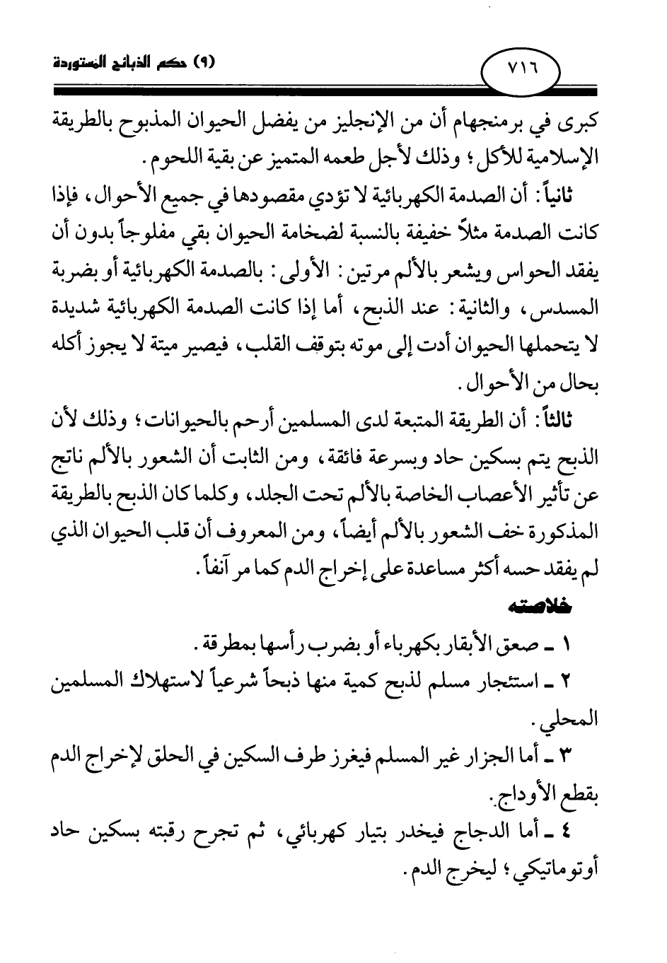 ثانيا: أن الصدمة الكهربائية لا تؤدي مقصودها في جميع الأحوال، فإذا كانت الصدمة مثلا خفيفة بالنسبة لضخامة الحيوان بقي مفلوجا بدون أن يفقد الحواس ويشعر بالألم مرتين: الأولى: بالصدمة الكهربائية أو بضربة المسدس، والثانية: عند الذبح، أما إذا كانت الصدمة الكهربائية شديدة لا يتحملها الحيوان أدت إلى موته بتوقف القلب، فيصير ميتة لا يجوز أكله بحال من الأحوال.