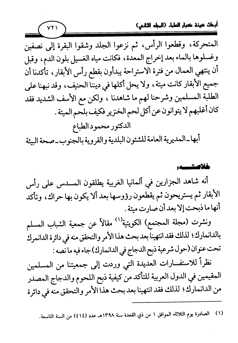 ونشرت (مجلة المجتمع) الكويتية (¬1) مقالا عن جمعية الشباب المسلم بالدانمارك؛ لذلك فقد انتهينا بعد بحث هذا الأمر والتحقق منه دائرة الدانمرك تحت عنوان (حول شرعية ذبح الدجاج في الدانمارك) جاء فيه ما نصه: