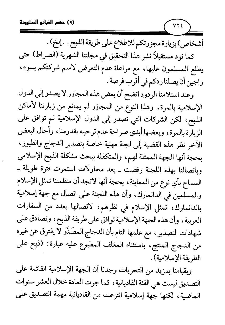 وعند استلامنا الردود اتضح أن بعض هذه المجازر لا يصدر إلى الدول الإسلامية بالمرة، وهذا النوع من المجازر لم يمانع من زيارتنا لأماكن الذبح، لكن الشركات التي تصدر إلى الدول الإسلامية لم توافق على الزيارة بالمرة، وبعضها أبدى صراحة عدم ترحيبه بقدومنا، وأحال البعض الآخر نظر هذه القضية إلى لجنة مهنية خاصة بتصدير الدجاج والطيور، بحجة أنها الجهة الممثلة لهم، والمتكفلة ببحث مشكلة الذبح الإسلامي وباتصالنا بهذه اللجنة رفضت- بعد محاولات استمرت فترة طويلة- السماح بأي نوع من المعاينة، بحجة أنها لا تجد أن منظمتنا تمثل الإسلام والمسلمين في الدانمارك، وأن هذه اللجنة على اتصال مع جهة إسلامية بالدانمارك، تمثل الإسلام في نظرهم، لاتصالها بعدد من السفارات العربية، وأن هذه الجهة الإسلامية توافق على طريقة الذبح، وتصادق على شهادات التصدير، مع علمها التام بأن الدجاج المصدر لا يفترق عن غيره من الدجاج المنتج، باستثناء المغلف المطبوع عليه عبارة: (ذبح على الطريقة الإسلامية) .