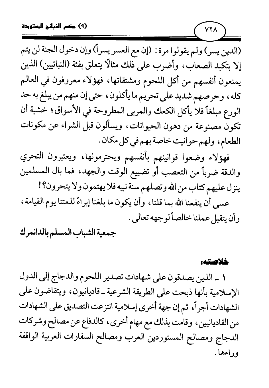 1 - الذين يصدقون على شهادات تصدير اللحوم والدجاج إلى الدول الإسلامية بأنها ذبحت على الطريقة الشرعية - قاديانيون، ويتقاضون على الشهادات أجرا، ثم إن جهة أخرى إسلامية انتزعت التصديق على الشهادات من القاديانيين، وقامت بذلك مع مهام أخرى، كالدفاع عن مصالح وشركات الدجاج ومصالح المستوردين العرب ومصالح السفارات العربية الواقفة وراءها.