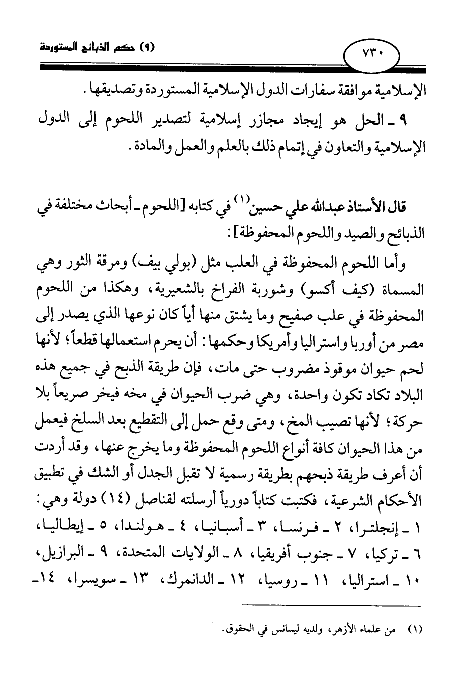 قال الأستاذ عبد الله على حسين (¬1) في كتابه [اللحوم - أبحاث مختلفة في الذبائح والصيد واللحوم المحفوظة] :