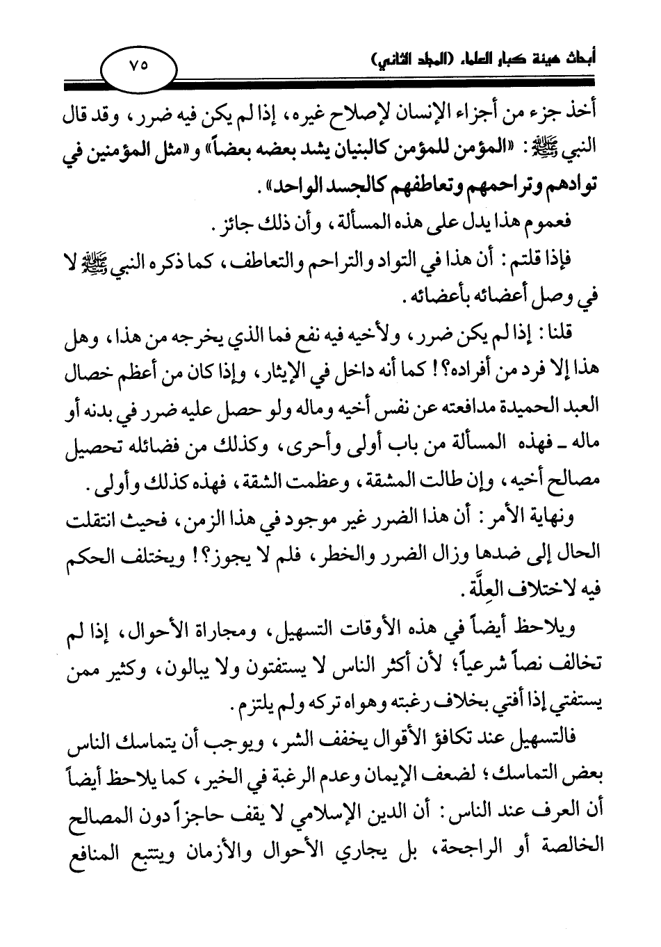 فالتسهيل عند تكافؤ الأقوال يخفف الشر، ويوجب أن يتماسك الناس بعض التماسك؛ لضعف الإيمان وعدم الرغبة في الخير، كما يلاحظ أيضا أن العرف عند الناس: أن الدين الإسلامي لا يقف حاجزا دون المصالح الخالصة أو الراجحة، بل يجاري الأحوال والأزمان ويتتبع المنافع