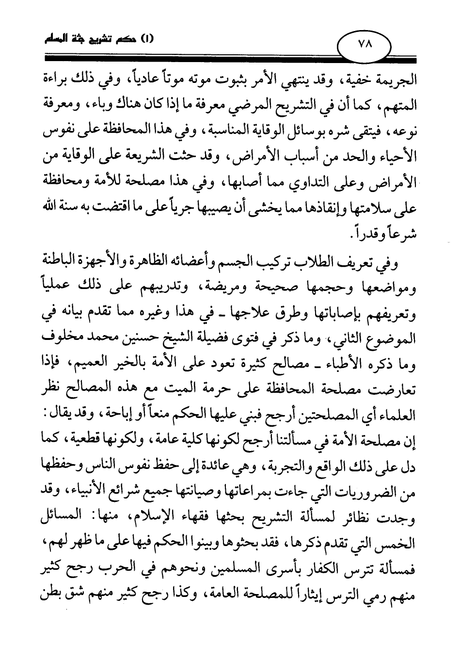 وفي تعريف الطلاب تركيب الجسم وأعضائه الظاهرة والأجهزة الباطنة ومواضعها وحجمها صحيحة ومريضة، وتدريبهم على ذلك عمليا وتعريفهم بإصاباتها وطرق علاجها - في هذا وغيره مما تقدم بيانه في الموضوع الثاني، وما ذكر في فتوى فضيلة الشيخ حسنين محمد مخلوف وما ذكره الأطباء - مصالح كثيرة تعود على الأمة بالخير العميم، فإذا تعارضت مصلحة المحافظة على حرمة الميت مع هذه المصالح نظر العلماء أي المصلحتين أرجح فبني عليها الحكم منعا أو إباحة، وقد يقال: إن مصلحة الأمة في مسألتنا أرجح لكونها كلية عامة، ولكونها قطعية، كما دل على ذلك الواقع والتجربة، وهي عائدة إلى حفظ نفوس الناس وحفظها من الضروريات التي جاءت بمراعاتها وصيانتها جميع شرائع الأنبياء، وقد وجدت نظائر لمسألة التشريح بحثها فقهاء الإسلام، منها: المسائل الخمس التي تقدم ذكرها، فقد بحثوها وبينوا الحكم فيها على ما ظهر لهم، فمسألة تترس الكفار بأسرى المسلمين ونحوهم في الحرب رجح كثير منهم رمي الترس إيثارا للمصلحة العامة، وكذا رجح كثير منهم شق بطن