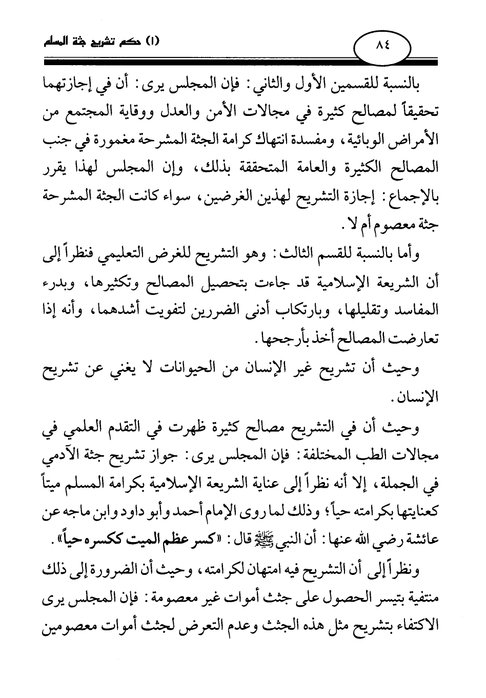 وحيث إن في التشريح مصالح كثيرة ظهرت في التقدم العلمي في مجالات الطب المختلفة: فإن المجلس يرى: جواز تشريح جثة الآدمي في الجملة، إلا أنه نظرا إلى عناية الشريعة الإسلامية بكرامة المسلم ميتا كعنايتها بكرامته حيا؛ وذلك لما روى الإمام أحمد وأبو داود وابن ماجه عن عائشة رضي الله عنها: أن النبي صلى الله عليه وسلم قال: «كسر عظم الميت ككسره حيا (¬1) » . ونظرا إلى أن التشريح فيه امتهان لكرامته، وحيث إن الضرورة إلى ذلك منتفية بتيسر الحصول على جثث أموات غير معصومة: فإن المجلس يرى الاكتفاء بتشريح مثل هذه الجثث وعدم التعرض لجثث أموات معصومين