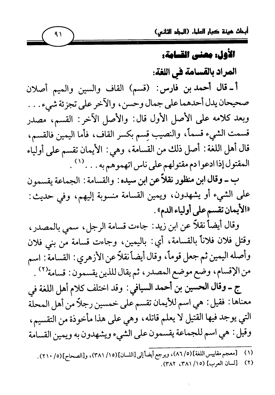 ب - وقال ابن منظور نقلا عن ابن سيده: والقسامة: الجماعة يقسمون على الشيء أو يشهدون، ويمين القسامة منسوبة إليهم، وفي حديث: «الأيمان تقسم على أولياء الدم» .