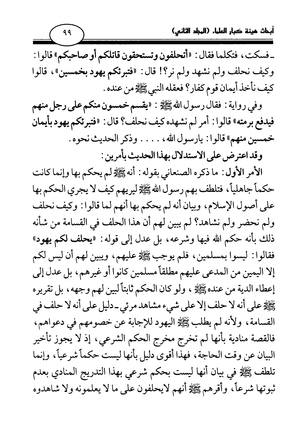 الأمر الأول: ما ذكره الصنعاني بقوله: أنه صلى الله عليه وسلم لم يحكم بها وإنما كانت حكما جاهليا، فتلطف بهم رسول الله صلى الله عليه وسلم ليريهم كيف لا يجري الحكم بها على أصول الإسلام، وبيان أنه لم يحكم بها أنهم لما قالوا: وكيف نحلف ولم نحضر ولم نشاهد؟ لم يبين لهم أن هذا الحلف في القسامة من شأنه ذلك بأنه حكم الله فيها وشرعه، بل عدل إلى قوله: «يحلف لكم يهود (¬3) » فقالوا: ليسوا بمسلمين، فلم يوجب صلى الله عليه وسلم عليهم، ويبين لهم أن ليس لكم إلا اليمين من المدعى عليهم مطلقا مسلمين كانوا أو غيرهم، بل عدل إلى إعطاء الدية من عنده صلى الله عليه وسلم، ولو كان الحكم ثابتا لبين لهم وجهه، بل تقريره صلى الله عليه وسلم على أنه لا حلف إلا على شيء مشاهد مرئي - دليل على أنه لا حلف في القسامة، ولأنه لم يطلب اليهود للإجابة عن خصومهم في دعواهم، فالقصة منادية بأنها لم تخرج مخرج الحكم الشرعي، إذ لا يجوز تأخير البيان عن وقت الحاجة، فهذا أقوى دليل بأنها ليست حكما شرعيا، وإنما تلطف صلى الله عليه وسلم في بيان أنها ليست بحكم شرعي بهذا التدريج المنادي بعدم ثبوتها شرعا، وأقرهم صلى الله عليه وسلم أنهم لا يحلفون على ما لا يعلمونه ولا شاهدوه