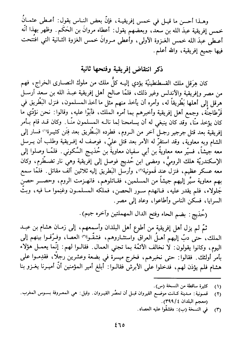 وَهَذَا أَحْسَنُ مَا قِيلَ فِي خُمُسِ إِفْرِيقِيَّةَ، فَإِنَّ بَعْضَ النَّاسِ يَقُولُ: أَعْطَى عُثْمَانُ خُمُسَ إِفْرِيقِيَّةَ عَبْدَ اللَّهِ بْنَ سَعْدٍ، وَبَعْضُهُمْ يَقُولُ: أَعْطَاهُ مَرْوَانَ بْنَ الْحَكَمِ. وَظَهَرَ بِهَذَا أَنَّهُ أَعْطَى عَبْدَ اللَّهِ خُمُسَ الْغَزْوَةِ الْأُولَى، وَأَعْطَى مَرْوَانَ خُمُسَ الْغَزْوَةِ الثَّانِيَةِ الَّتِي افْتُتِحَتْ فِيهَا جَمِيعُ إِفْرِيقِيَّةَ، وَاللَّهُ أَعْلَمُ.