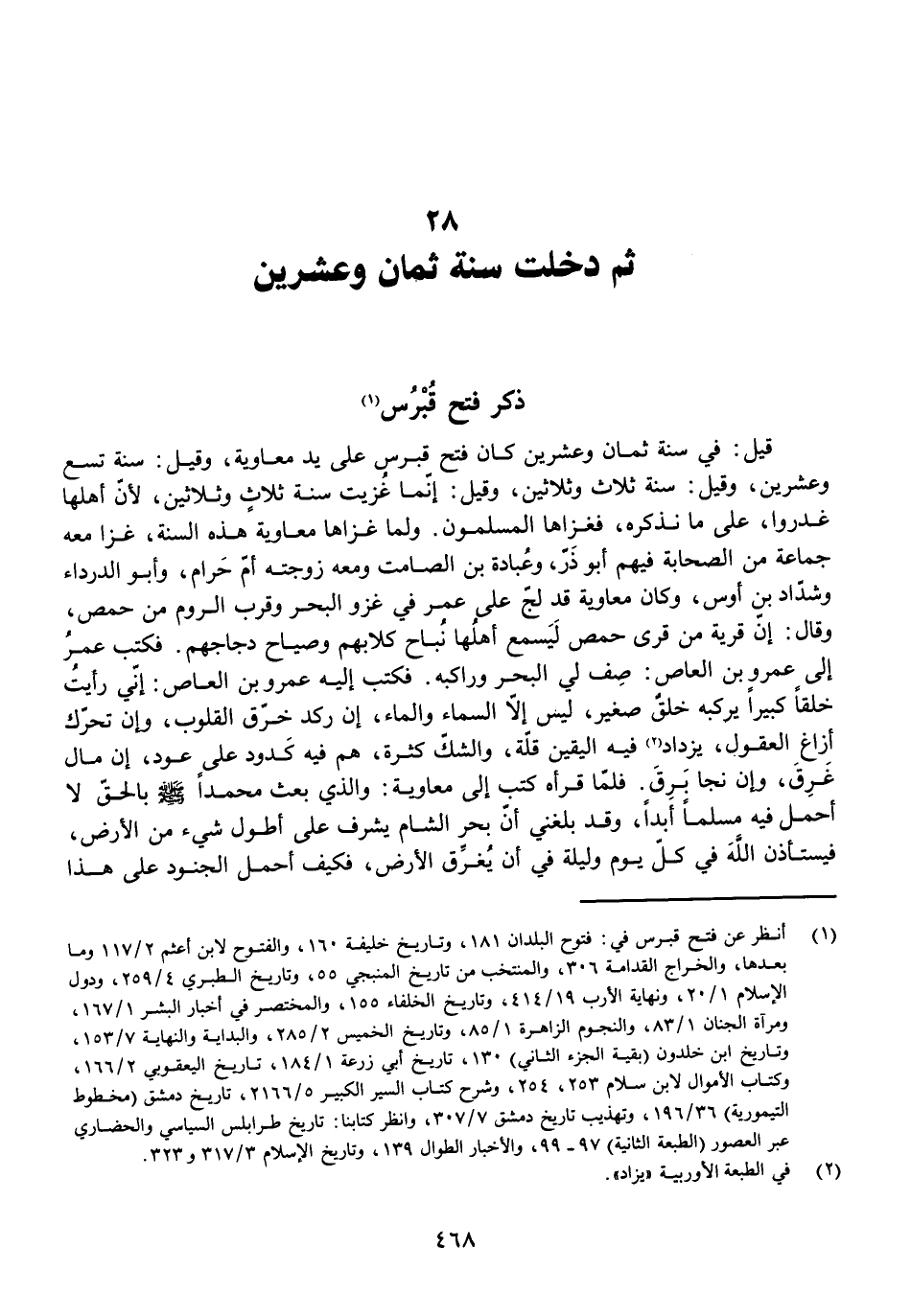 قِيلَ: فِي سَنَةِ ثَمَانٍ وَعِشْرِينَ كَانَ فَتْحُ قُبْرُسَ عَلَى يَدِ مُعَاوِيَةَ، وَقِيلَ: سَنَةَ تِسْعٍ وَعِشْرِينَ، وَقِيلَ سَنَةَ ثَلَاثٍ وَثَلَاثِينَ، وَقِيلَ: إِنَّمَا غُزِيَتْ سَنَةَ ثَلَاثٍ وَثَلَاثِينَ لِأَنَّ أَهْلَهَا غَدَرُوا، عَلَى مَا نَذْكُرُهُ، فَغَزَاهَا الْمُسْلِمُونَ. وَلَمَّا غَزَاهَا مُعَاوِيَةُ هَذِهِ السَّنَةَ، غَزَا مَعَهُ جَمَاعَةٌ مِنَ الصَّحَابَةِ فِيهِمْ أَبُو ذَرٍّ، وَعُبَادَةُ بْنُ الصَّامِتِ، وَمَعَهُ زَوْجَتُهُ أُمُّ حَرَامٍ، وَأَبُو الدَّرْدَاءِ، وَشَدَّادُ بْنُ أَوْسٍ، وَكَانَ مُعَاوِيَةُ قَدْ لَجَّ عَلَى عُمَرَ فِي غَزْوِ الْبَحْرِ وَقُرْبِ الرُّومِ مِنْ حِمْصَ، وَقَالَ: إِنَّ قَرْيَةً مِنْ قُرَى حِمْصَ لِيَسْمَعُ أَهْلُهَا نُبَاحَ كِلَابِهِمْ وَصِيَاحَ دَجَاجِهِمْ. فَكَتَبَ عُمَرُ إِلَى عَمْرِو بْنِ الْعَاصِ: صِفْ لِي الْبَحْرَ وَرَاكِبَهُ. فَكَتَبَ إِلَيْهِ عَمْرُو بْنُ الْعَاصِ: إِنِّي رَأَيْتُ خَلْقًا كَبِيرًا يَرْكَبُهُ خَلْقٌ صَغِيرٌ، لَيْسَ إِلَّا السَّمَاءُ وَالْمَاءُ، إِنْ رَكَدَ خَرَقَ الْقُلُوبَ، وَإِنَّ تَحَرَّكَ أَزَاغَ الْعُقُولَ، يَزْدَادُ فِيهِ الْيَقِينُ قِلَّةً، وَالشَّكُّ كَثْرَةً، هُمْ فِيهِ كَدُودٍ عَلَى عُودٍ، إِنْ مَالَ غَرِقَ، وَإِنْ نَجَا بَرِقَ. فَلَمَّا قَرَأَهُ كَتَبَ إِلَى مُعَاوِيَةَ: وَالَّذِي بَعَثَ مُحَمَّدًا - صَلَّى اللَّهُ عَلَيْهِ وَسَلَّمَ -، بِالْحَقِّ لَا أَحْمِلُ فِيهِ مُسْلِمًا أَبَدًا، وَقَدْ بَلَغَنِي أَنَّ بَحْرَ الشَّامِ يُشْرِفُ عَلَى أَطْوَلِ شَيْءٍ مِنَ الْأَرْضِ، فَيَسْتَأْذِنُ اللَّهَ فِي كُلِّ يَوْمٍ وَلَيْلَةٍ فِي أَنْ يُغْرِقَ الْأَرْضَ، فَكَيْفَ أَحْمِلُ الْجُنُودَ عَلَى هَذَا