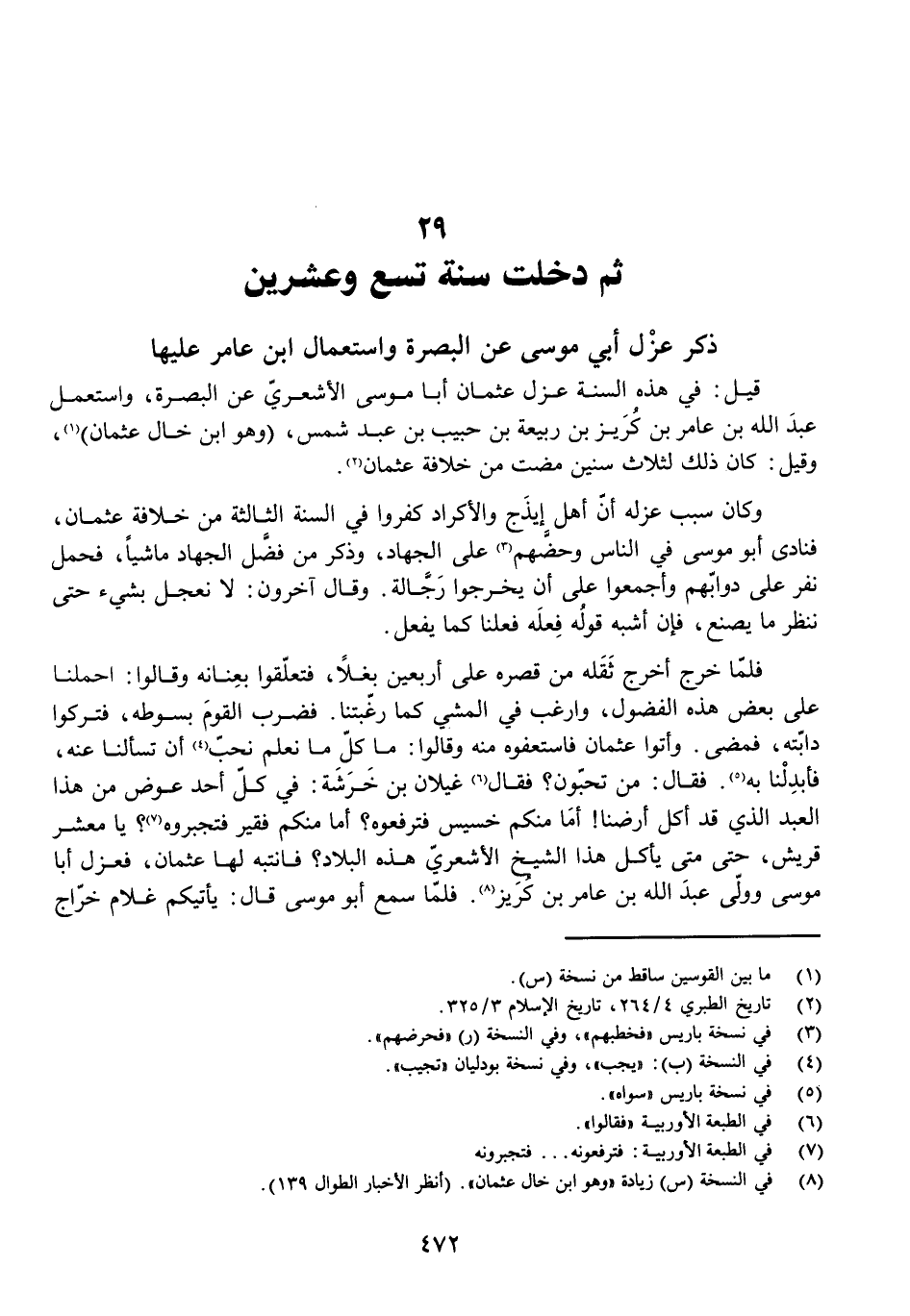 ذكر عَزْلِ أَبِي مُوسَى عَنِ الْبَصْرَةِ وَاسْتِعْمَالِ ابْنِ عَامِرٍ عَلَيْهَا