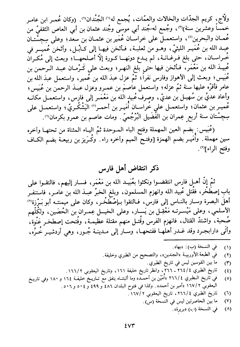 ذكر انْتِقَاضِ أَهْلِ فَارِسَ ثُمَّ إِنَّ أَهْلَ فَارِسَ انْتَفَضُوا وَنَكَثُوا بِعُبَيْدِ اللَّهِ بْنِ مَعْمَرٍ، فَسَارَ إِلَيْهِمْ، فَالْتَقَوْا عَلَى بَابِ إِصْطَخْرَ، فَقُتِلَ عُبَيْدُ اللَّهِ وَانْهَزَمَ الْمُسْلِمُونَ، وَبَلَغَ الْخَبَرُ عَبْدَ اللَّهِ بْنَ عَامِرٍ، فَاسْتَنْفَرَ أَهْلَ الْبَصْرَةِ وَسَارَ بِالنَّاسِ إِلَى فَارِسَ فَالْتَقَوْا بِإِصْطَخْرَ، وَكَانَ عَلَى مَيْمَنَتِهِ أَبُو بَرْزَةَ الْأَسْلَمِيُّ، وَعَلَى مَيْسَرَتِهِ مَعْقِلُ بْنُ يَسَارٍ، وَعَلَى الْخَيْلِ عِمْرَانُ بْنُ الْحُصَيْنِ، وَلِكُلِّهِمْ صُحْبَةٌ، وَاشْتَدَّ الْقِتَالُ، فَانْهَزَمَ الْفُرْسُ وَقُتِلَ مِنْهُمْ مَقْتَلَةٌ عَظِيمَةٌ، وَفُتِحَتْ إِصْطَخْرُ عَنْوَةً، وَأَتَى دَارَابْجِرْدَ وَقَدْ غَدَرَ أَهْلُهَا فَفَتَحَهَا، وَسَارَ إِلَى مَدِينَةِ جُورَ، وَهِيَ أَرْدَشِيرُ خُرَّهْ،