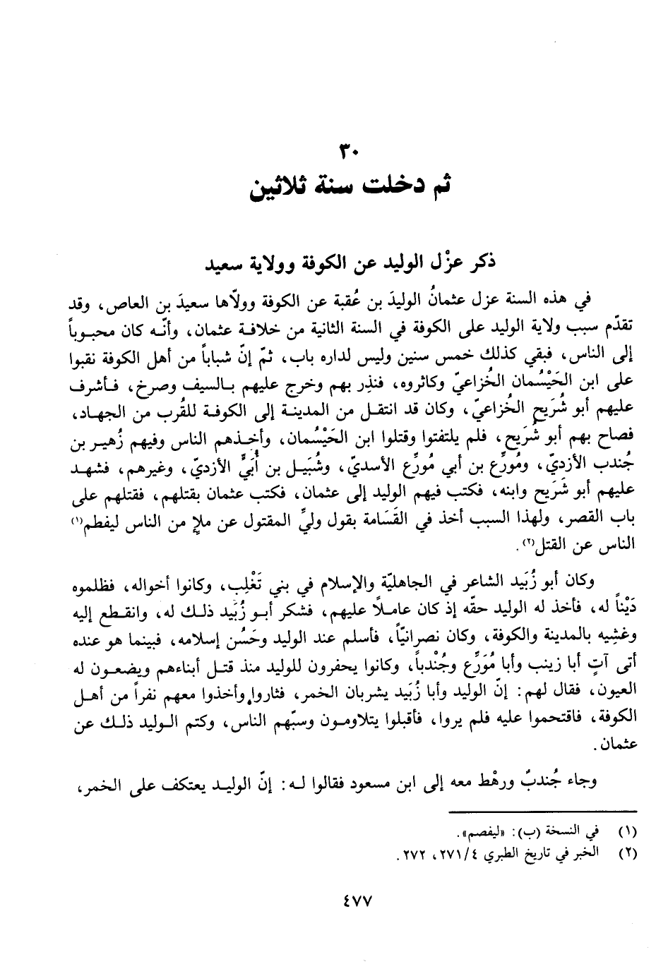 فِي هَذِهِ السَّنَةِ عَزَلَ عُثْمَانُ الْوَلِيدَ بْنَ عُقْبَةَ عَنِ الْكُوفَةِ وَوَلَّاهَا سَعِيدَ بْنَ الْعَاصِ، وَقَدْ تَقَدَّمَ سَبَبُ وِلَايَةِ الْوَلِيدِ عَلَى الْكُوفَةِ فِي السَّنَةِ الثَّانِيَةِ مِنْ خِلَافَةِ عُثْمَانَ، وَأَنَّهُ كَانَ مَحْبُوبًا إِلَى النَّاسِ، فَبَقِيَ كَذَلِكَ خَمْسَ سِنِينَ وَلَيْسَ لِدَارِهِ بَابٌ، ثُمَّ إِنَّ شَبَابًا مِنْ أَهْلِ الْكُوفَةِ نَقَبُوا عَلَى ابْنِ الْحَيْسُمَانِ الْخُزَاعِيِّ وَكَاثَرُوهُ، فَنَذِرَ بِهِمْ وَخَرَجَ عَلَيْهِمْ بِالسَّيْفِ وَصَرَخَ، فَأَشْرَفَ عَلَيْهِمْ أَبُو شُرَيْحٍ الْخُزَاعِيُّ، وَكَانَ قَدِ انْتَقَلَ مِنَ الْمَدِينَةِ إِلَى الْكُوفَةِ لِلْقُرْبِ مِنَ الْجِهَادِ، فَصَاحَ بِهِمْ أَبُو شُرَيْحٍ، فَلَمْ يَلْتَفِتُوا وَقَتَلُوا ابْنَ الْحَيْسُمَانِ، وَأَخَذَهُمُ النَّاسُ وَفِيهِمْ زُهَيْرُ بْنُ جُنْدُبٍ الْأَزْدِيُّ وَمُوَرِّعُ بْنُ أَبِي مُوَرِّعٍ الْأَسَدِيُّ، وَشُبَيْلُ بْنُ أُبَيٍّ الْأَزْدِيُّ وَغَيْرُهُمْ، فَشَهِدَ عَلَيْهِمْ أَبُو شُرَيْحٍ وَابْنُهُ، فَكَتَبَ فِيهِمُ الْوَلِيدُ إِلَى عُثْمَانَ، فَكَتَبَ عُثْمَانُ بِقَتْلِهِمْ، فَقَتَلَهُمْ عَلَى بَابِ الْقَصْرِ، وَلِهَذَا السَّبَبِ أَخَذَ فِي الْقَسَامَةِ بِقَوْلِ وَلِيِّ الْمَقْتُولِ عَنْ مَلَإٍ مِنَ النَّاسِ لِيَفْطِمَ النَّاسَ عَنِ الْقَتْلِ.