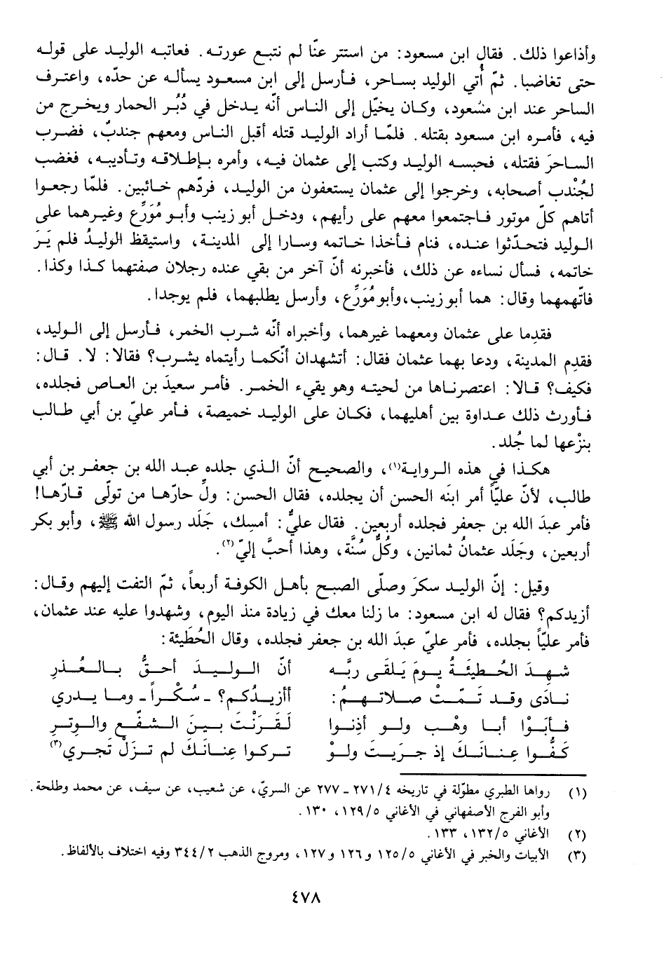 وَقِيلَ: إِنَّ الْوَلِيدَ سَكِرَ وَصَلَّى الصُّبْحَ بِأَهْلِ الْكُوفَةِ أَرْبَعًا ثُمَّ الْتَفَتَ إِلَيْهِمْ وَقَالَ: أَزِيدُكُمْ؟ فَقَالَ لَهُ ابْنُ مَسْعُودٍ: مَا زِلْنَا مَعَكَ فِي زِيَادَةٍ مُنْذُ الْيَوْمِ، وَشَهِدُوا عَلَيْهِ عِنْدَ عُثْمَانَ، فَأَمَرَ عَلِيًّا بِجَلْدِهِ، فَأَمَرَ عَلِيٌّ عَبْدَ اللَّهِ بْنَ جَعْفَرٍ فَجَلَدَهُ، وَقَالَ الْحُطَيْئَةُ: