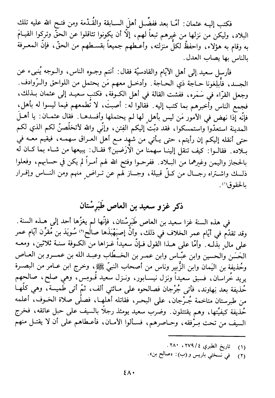 فِي هَذِهِ السَّنَةِ غَزَا سَعِيدُ بْنُ الْعَاصِ طَبَرِسْتَانَ، فَإِنَّهَا لَمْ يَغْزُهَا أَحَدٌ إِلَى هَذِهِ السَّنَةِ. وَقَدْ تَقَدَّمَ فِي أَيَّامِ عُمَرَ الْخِلَافُ فِي ذَلِكَ، وَأَنَّ إِصْبَهْبَذَهَا صَالَحَ سُويدَ بْنَ مُقَرِّنٍ أَيَّامَ عُمَرَ عَلَى مَالٍ بَذَلَهُ. وَأَمَّا عَلَى هَذَا الْقَوْلِ فَإِنَّ سَعِيدًا غَزَاهَا مِنَ الْكُوفَةِ سَنَةَ ثَلَاثِينَ، وَمَعَهُ الْحَسَنُ وَالْحُسَيْنُ وَابْنُ عَبَّاسٍ وَابْنُ عُمَرَ بْنِ الْخَطَّابِ وَعَبْدُ اللَّهِ بْنُ عَمْرِو بْنِ الْعَاصِ وَحُذَيْفَةُ بْنُ الْيَمَانِ وَابْنُ الزُّبَيْرِ وَنَاسٌ مِنْ أَصْحَابِ النَّبِيِّ - صَلَّى اللَّهُ عَلَيْهِ وَسَلَّمَ -، وَخَرَجَ ابْنُ عَامِرٍ مِنَ الْبَصْرَةِ يُرِيدُ خُرَاسَانَ، فَسَبَقَ سَعِيدًا وَنَزَلَ نَيْسَابُورَ، وَنَزَلَ سَعِيدٌ قُومِسَ، وَهِيَ صُلْحٌ، صَالَحَهُمْ حُذَيْفَةُ بَعْدَ نَهَاوَنْدَ، فَأَتَى جُرْجَانَ فَصَالَحُوهُ عَلَى مِائَتَيْ أَلْفٍ، ثُمَّ أَتَى طَمِيسَةَ، وَهِيَ كُلُّهَا مِنْ طَبَرِسْتَانَ مُتَاخِمَةٌ جُرْجَانَ، عَلَى الْبَحْرِ، فَقَاتَلَهُ أَهْلُهَا، فَصَلَّى صَلَاةَ الْخَوْفِ، أَعْلَمَهُ حُذَيْفَةُ كَيْفِيَّتَهَا، وَهُمْ يَقْتَتِلُونَ. وَضَرَبَ سَعِيدٌ يَوْمَئِذٍ رَجُلًا بِالسَّيْفِ عَلَى حَبْلِ عَاتِقِهِ، فَخَرَجَ السَّيْفُ مِنْ تَحْتِ مِرْفَقِهِ، وَحَاصَرَهُمْ، فَسَأَلُوا الْأَمَانَ، فَأَعْطَاهُمْ عَلَى أَنْ لَا يَقْتُلَ مِنْهُمْ