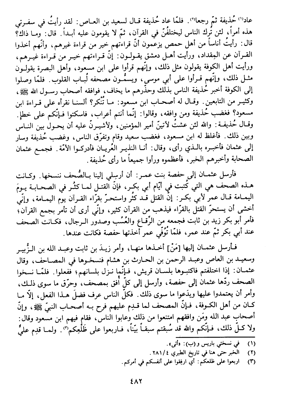 فَأَرْسَلَ عُثْمَانُ إِلَيْهَا [مَنْ] أَخَذَهَا مِنْهَا، وَأَمَرَ زَيْدَ بْنَ ثَابِتٍ وَعَبْدَ اللَّهِ بْنَ الزُّبَيْرِ وَسَعِيدَ بْنَ الْعَاصِ وَعَبْدَ الرَّحْمَنِ بْنَ الْحَارِثِ بْنِ هِشَامٍ فَنَسَخُوهَا فِي الْمَصَاحِفِ، وَقَالَ عُثْمَانُ: إِذَا اخْتَلَفْتُمْ فَاكْتُبُوهَا بِلِسَانِ قُرَيْشٍ، فَإِنَّمَا نَزَلَ بِلِسَانِهِمْ، فَفَعَلُوا. فَلَمَّا نَسَخُوا الصُّحُفَ رَدَّهَا عُثْمَانُ إِلَى حَفْصَةَ، وَأَرْسَلَ إِلَى كُلِّ أُفُقٍ بِمُصْحَفٍ، وَحَرَقَ مَا سِوَى ذَلِكَ، وَأَمَرَ أَنْ يَعْتَمِدُوا عَلَيْهَا وَيَدَعُوا مَا سِوَى ذَلِكَ. فَكُلُّ النَّاسِ عَرَفَ فَضْلَ هَذَا الْفِعْلِ، إِلَّا مَا كَانَ مِنْ أَهْلِ الْكُوفَةِ، فَإِنَّ الْمُصْحَفَ لَمَّا قَدِمَ عَلَيْهِمْ فَرِحَ بِهِ أَصْحَابُ النَّبِيِّ - صَلَّى اللَّهُ عَلَيْهِ وَسَلَّمَ -، وَإِنَّ أَصْحَابَ عَبْدِ اللَّهِ وَمَنْ وَافَقَهُمُ امْتَنَعُوا مِنْ ذَلِكَ وَعَابُوا النَّاسَ، فَقَامَ فِيهِمُ ابْنُ مَسْعُودٍ وَقَالَ: وَلَا كُلُّ ذَلِكَ، فَإِنَّكُمْ وَاللَّهِ قَدْ سُبِقْتُمْ سَبْقًا بَيِّنًا، فَارْبِعُوا عَلَى ظَلْعِكُمْ. وَلَمَّا قَدِمَ عَلِيٌّ
