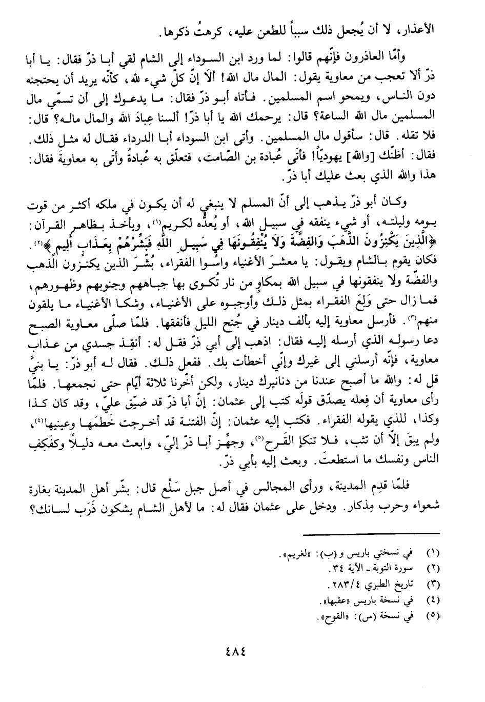 وَكَانَ أَبُو ذَرٍّ يَذْهَبُ إِلَى أَنَّ الْمُسْلِمَ لَا يَنْبَغِي لَهُ أَنْ يَكُونَ فِي مِلْكِهِ أَكْثَرُ مِنْ قُوتِ يَوْمِهِ وَلَيْلَتِهِ، أَوْ شَيْءٍ يُنْفِقُهُ فِي سَبِيلِ اللَّهِ، أَوْ يُعِدُّهُ لِكَرِيمٍ، وَيَأْخُذُ بِظَاهِرِ الْقُرْآنِ {الَّذِينَ يَكْنِزُونَ الذَّهَبَ وَالْفِضَّةَ وَلَا يُنْفِقُونَهَا فِي سَبِيلِ اللَّهِ فَبَشِّرْهُمْ بِعَذَابٍ أَلِيمٍ} [التوبة: 34] . فَكَانَ يَقُومُ بِالشَّامِ وَيَقُولُ: يَا مَعْشَرَ الْأَغْنِيَاءِ وَاسُوا الْفُقَرَاءَ، بَشِّرِ الَّذِينَ يَكْنِزُونَ الذَّهَبَ وَالْفِضَّةَ وَلَا يُنْفِقُونَهَا فِي سَبِيلِ اللَّهِ بِمَكَاوٍ مِنْ نَارٍ تُكْوَى بِهَا جِبَاهُهُمْ وَجُنُوبُهُمْ وَظُهُورُهُمْ، فَمَا زَالَ حَتَّى وَلِعَ الْفُقَرَاءُ بِمِثْلِ ذَلِكَ وَأَوْجَبُوهُ عَلَى الْأَغْنِيَاءِ، وَشَكَا الْأَغْنِيَاءُ مَا يَلْقَوْنَ مِنْهُمْ. فَأَرْسَلَ مُعَاوِيَةُ إِلَيْهِ بِأَلْفِ دِينَارٍ فِي جُنْحِ اللَّيْلِ فَأَنْفَقَهَا. فَلَمَّا صَلَّى مُعَاوِيَةُ الصُّبْحَ دَعَا رَسُولَهُ الَّذِي أَرْسَلَهُ إِلَيْهِ فَقَالَ: اذْهَبْ إِلَى أَبِي ذَرٍّ فَقُلْ لَهُ: أَنْقِذْ جَسَدِي مِنْ عَذَابِ مُعَاوِيَةَ، فَإِنَّهُ أَرْسَلَنِي إِلَى غَيْرِكَ وَإِنِّي أَخْطَأْتُ بِكَ. فَفَعَلَ ذَلِكَ. فَقَالَ لَهُ أَبُو ذَرٍّ: يَا بُنَيَّ قُلْ لَهُ: وَاللَّهِ مَا أَصْبَحَ عِنْدَنَا مِنْ دَنَانِيرِكَ دِينَارٌ وَلَكِنْ أَخِّرْنَا ثَلَاثَةَ أَيَّامٍ حَتَّى نَجْمَعَهَا. فَلَمَّا رَأَى مُعَاوِيَةُ أَنَّ فِعْلَهُ يَصْدُقُ قَوْلَهُ كَتَبَ إِلَى عُثْمَانَ: إِنَّ أَبَا ذَرٍّ قَدْ ضَيَّقَ عَلَيَّ، وَقَدْ كَانَ كَذَا وَكَذَا، لِلَّذِي يَقُولُهُ الْفُقَرَاءُ. فَكَتَبَ إِلَيْهِ عُثْمَانُ: إِنَّ الْفِتْنَةَ قَدْ أَخْرَجَتْ خَطْمَهَا وَعَيْنَيْهَا وَلَمْ يَبْقَ إِلَّا أَنْ تَثِبَ، فَلَا تَنْكَأِ الْقَرْحَ، وَجَهِّزْ أَبَا ذَرٍّ إِلَيَّ، وَابْعَثْ مَعَهُ دَلِيلًا وَكَفْكِفِ النَّاسَ وَنَفْسَكَ مَا اسْتَطَعْتَ. وَبَعَثَ إِلَيْهِ بِأَبِي ذَرٍّ.