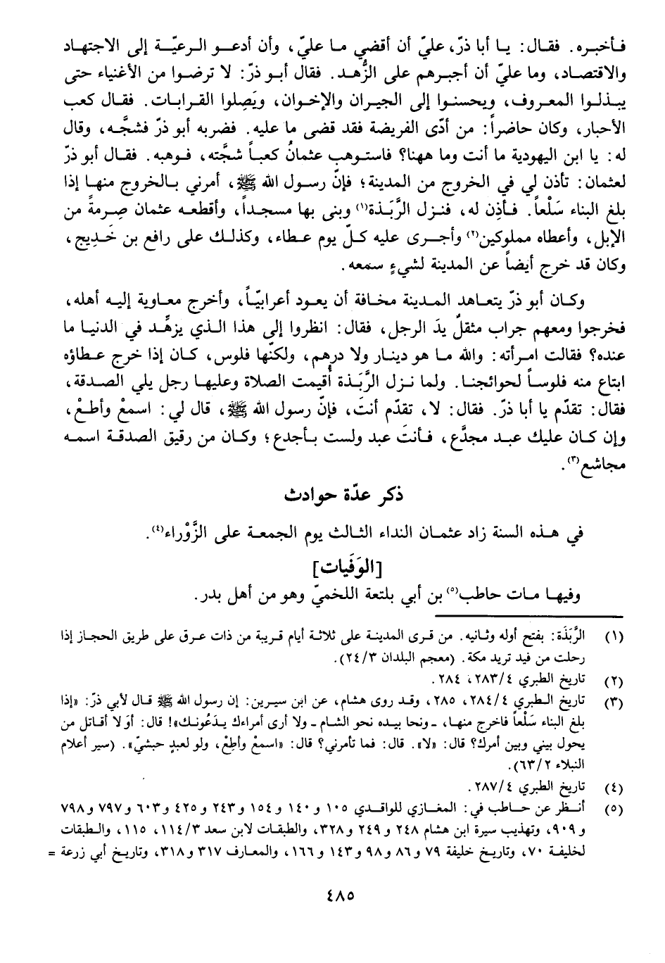 فَأَخْبَرَهُ. فَقَالَ: يَا أَبَا ذَرٍّ عَلَيَّ أَنْ أَقْضِيَ مَا عَلَيَّ، وَأَنْ أَدْعُوَ الرَّعِيَّةَ إِلَى الِاجْتِهَادِ وَالِاقْتِصَادِ، وَمَا عَلَيَّ أَنْ أُجْبِرَهُمْ عَلَى الزُّهْدِ. فَقَالَ أَبُو ذَرٍّ: لَا تَرْضَوْا مِنَ الْأَغْنِيَاءِ حَتَّى يَبْذُلُوا الْمَعْرُوفَ، وَيُحْسِنُوا إِلَى الْجِيرَانِ وَالْإِخْوَانِ، وَيَصِلُوا الْقَرَابَاتِ. فَقَالَ كَعْبُ الْأَحْبَارِ، وَكَانَ حَاضِرًا: مَنْ أَدَّى الْفَرِيضَةَ فَقَدْ قَضَى مَا عَلَيْهِ. فَضَرَبَهُ أَبُو ذَرٍّ فَشَجَّهُ، وَقَالَ لَهُ: يَا ابْنَ الْيَهُودِيَّةِ مَا أَنْتَ وَمَا هَاهُنَا؟ فَاسْتَوْهَبَ عُثْمَانُ كَعْبًا شَجَّتَهُ، فَوَهَبَهُ. فَقَالَ أَبُو ذَرٍّ لِعُثْمَانَ: تَأْذَنُ لِي فِي الْخُرُوجِ مِنَ الْمَدِينَةِ، فَإِنَّ رَسُولَ اللَّهِ - صَلَّى اللَّهُ عَلَيْهِ وَسَلَّمَ - أَمَرَنِي بِالْخُرُوجِ مِنْهَا إِذَا بَلَغَ الْبِنَاءُ سَلْعًا. فَأَذِنَ لَهُ، فَنَزَلَ الرَّبَذَةَ وَبَنَى بِهَا مَسْجِدًا، وَأَقْطَعَهُ عُثْمَانُ صِرْمَةً مِنَ الْإِبِلِ، وَأَعْطَاهُ مَمْلُوكَيْنِ وَأَجْرَى عَلَيْهِ كُلَّ يَوْمٍ عَطَاءً، وَكَذَلِكَ عَلَى رَافِعِ بْنِ خَدِيجٍ، وَكَانَ قَدْ خَرَجَ أَيْضًا عَنِ الْمَدِينَةِ لِشَيْءٍ سَمِعَهُ.