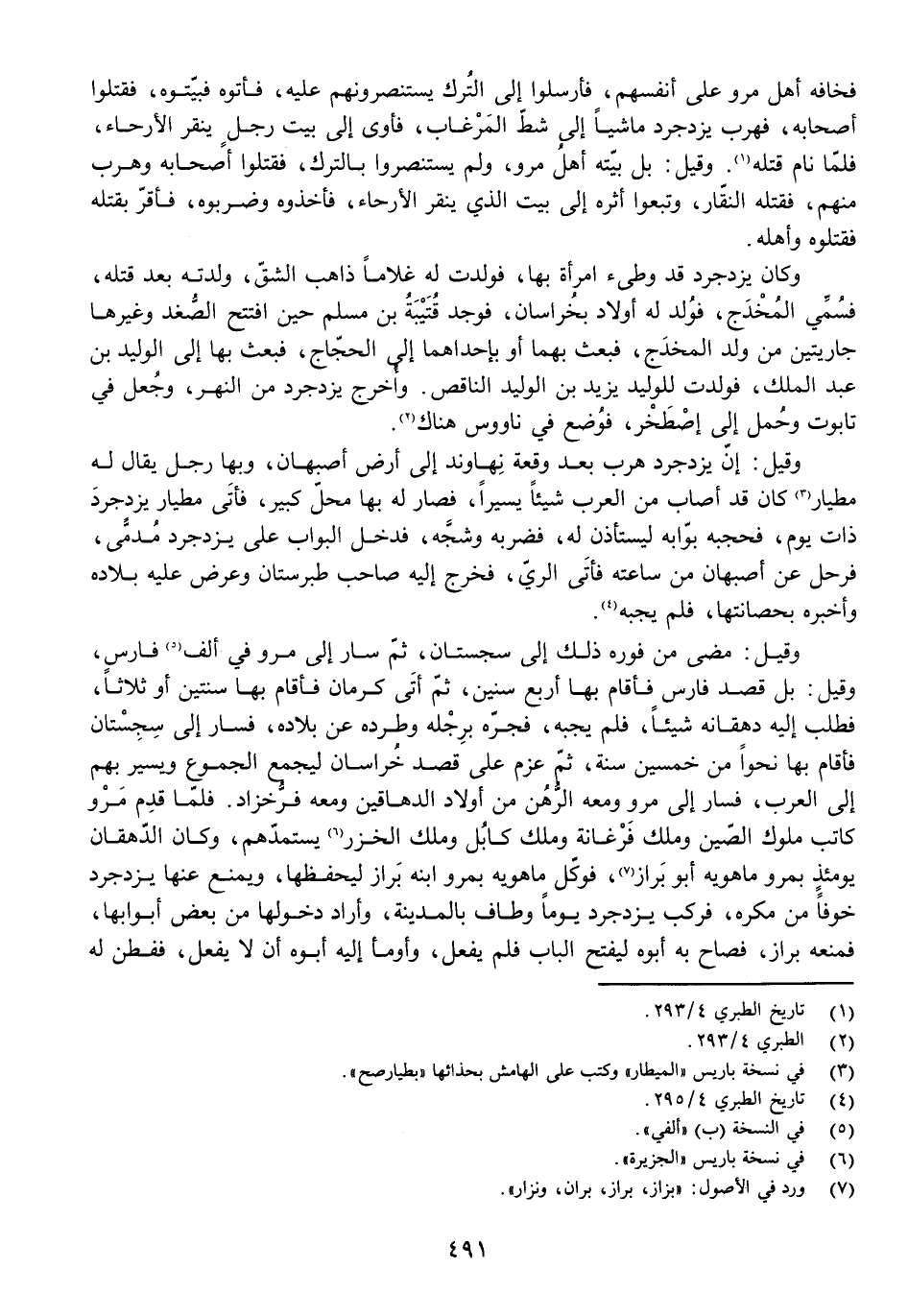 وَقِيلَ: مَضَى مِنْ فَوْرِهِ ذَلِكَ إِلَى سِجِسْتَانَ، ثُمَّ سَارَ إِلَى مَرْوَ فِي أَلْفِ فَارِسٍ، وَقِيلَ: بَلْ قَصَدَ فَارِسَ فَأَقَامَ بِهَا أَرْبَعَ سِنِينَ، ثُمَّ أَتَى كَرْمَانَ فَأَقَامَ بِهَا سَنَتَيْنِ أَوْ ثَلَاثًا فَطَلَبَ إِلَيْهِ دِهْقَانُهُ شَيْئًا، فَلَمْ يُجِبْهُ، فَجَرَّهُ بِرِجْلِهِ وَطَرَدَهُ عَنْ بِلَادِهِ، فَسَارَ إِلَى سِجِسْتَانَ فَأَقَامَ بِهَا نَحْوًا مِنْ خَمْسِ سِنِينَ، ثُمَّ عَزَمَ عَلَى قَصْدِ خُرَاسَانَ لِيَجْمَعَ الْجُمُوعَ وَيَسِيرَ بِهِمْ إِلَى الْعَرَبِ، فَسَارَ إِلَى مَرْوَ وَمَعَهُ الرَّهْنُ مِنْ أَوْلَادِ الدَّهَاقِينِ وَمَعَهُ فَرُّخَزَادُ. فَلَمَّا قَدِمَ مَرْوَ كَاتَبَ مُلُوكَ الصِّينِ وَمَلِكَ فَرْغَانَةَ وَمَلِكَ كَابُلَ وَمَلِكَ الْخَزَرِ يَسْتَمِدُّهُمْ، وَكَانَ الدِّهْقَانَ يَوْمَئِذٍ بِمَرْوَ مَاهَوَيْهِ أَبُو بَرَازَ، فَوَكَّلَ مَاهَوَيْهِ بِمَرْوَ ابْنَهُ بَرَازَ لِيَحْفَظَهَا، وَيَمْنَعَ عَنْهَا يَزْدَجِرْدَ خَوْفًا مِنْ مَكْرَهٍ، فَرَكِبَ يَزْدَجِرْدُ يَوْمًا وَطَافَ بِالْمَدِينَةِ، وَأَرَادَ دُخُولَهَا مِنْ بَعْضِ أَبْوَابِهَا، فَمَنَعَهُ بَرَازُ، فَصَاحَ بِهِ أَبُوهُ لِيَفْتَحَ الْبَابَ فَلَمْ يَفْعَلْ، وَأَوْمَأَ إِلَيْهِ أَبُوهُ أَنْ لَا يَفْعَلَ، فَفَطِنَ لَهُ