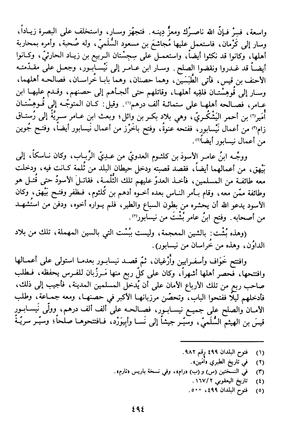 وَاسِعَةٌ، فَسِرْ فَإِنَّ اللَّهَ نَاصِرُكَ وَمُعِزٌّ دِينَهُ. فَتَجَهَّزَ وَسَارَ وَاسْتَخْلَفَ عَلَى الْبَصْرَةِ زِيَادًا، وَسَارَ إِلَى كَرْمَانَ، فَاسْتَعْمَلَ عَلَيْهَا مُجَاشِعَ بْنَ مَسْعُودٍ السُّلَمِيَّ، وَلَهُ صُحْبَةٌ، وَأَمَرَهُ بِمُحَارَبَةِ أَهْلِهَا، وَكَانُوا قَدْ نَكَثُوا أَيْضًا، وَاسْتَعْمَلَ عَلَى سِجِسْتَانَ الرَّبِيعَ بْنَ زِيَادٍ الْحَارِثِيَّ، وَكَانُوا أَيْضًا قَدْ غَدَرُوا وَنَقَضُوا الصُّلْحَ. وَسَارَ ابْنُ عَامِرٍ إِلَى نَيْسَابُورَ، وَجَعَلَ عَلَى مُقَدَّمَتِهِ الْأَحْنَفَ بْنَ قَيْسٍ، فَأَتَى الطَّبَسَيْنِ، وَهُمَا حِصْنَانِ، وَهُمَا بَابَا خُرَاسَانَ، فَصَالَحَهُ أَهْلُهُمَا، وَسَارَ إِلَى قُوهِسْتَانَ فَلَقِيَهُ أَهْلُهَا، وَقَاتَلَهُمْ حَتَّى أَلْجَأَهُمْ إِلَى حِصْنِهِمْ، وَقَدِمَ عَلَيْهَا ابْنُ عَامِرٍ، فَصَالَحَهُ أَهْلُهَا عَلَى سِتِّمِائَةِ أَلْفِ دِرْهَمٍ. وَقِيلَ: كَانَ الْمُتَوَجِّهَ إِلَى قُوهِسْتَانَ أُمَيْرُ بْنُ أَحْمَرُ الْيَشْكُرِيُّ - وَهِيَ بِلَادُ بَكْرِ بْنِ وَائِلٍ - وَبَعَثَ ابْنُ عَامِرٍ سَرِيَّةً إِلَى رُسْتَاقِ زَامَ مِنْ أَعْمَالِ نَيْسَابُورَ، فَفَتَحَهُ عَنْوَةً، وَفَتَحَ بَاخَرْزَ مِنْ أَعْمَالِ نَيْسَابُورَ أَيْضًا، وَفَتَحَ جُوَيْنَ مِنْ أَعْمَالِ نَيْسَابُورَ أَيْضًا.