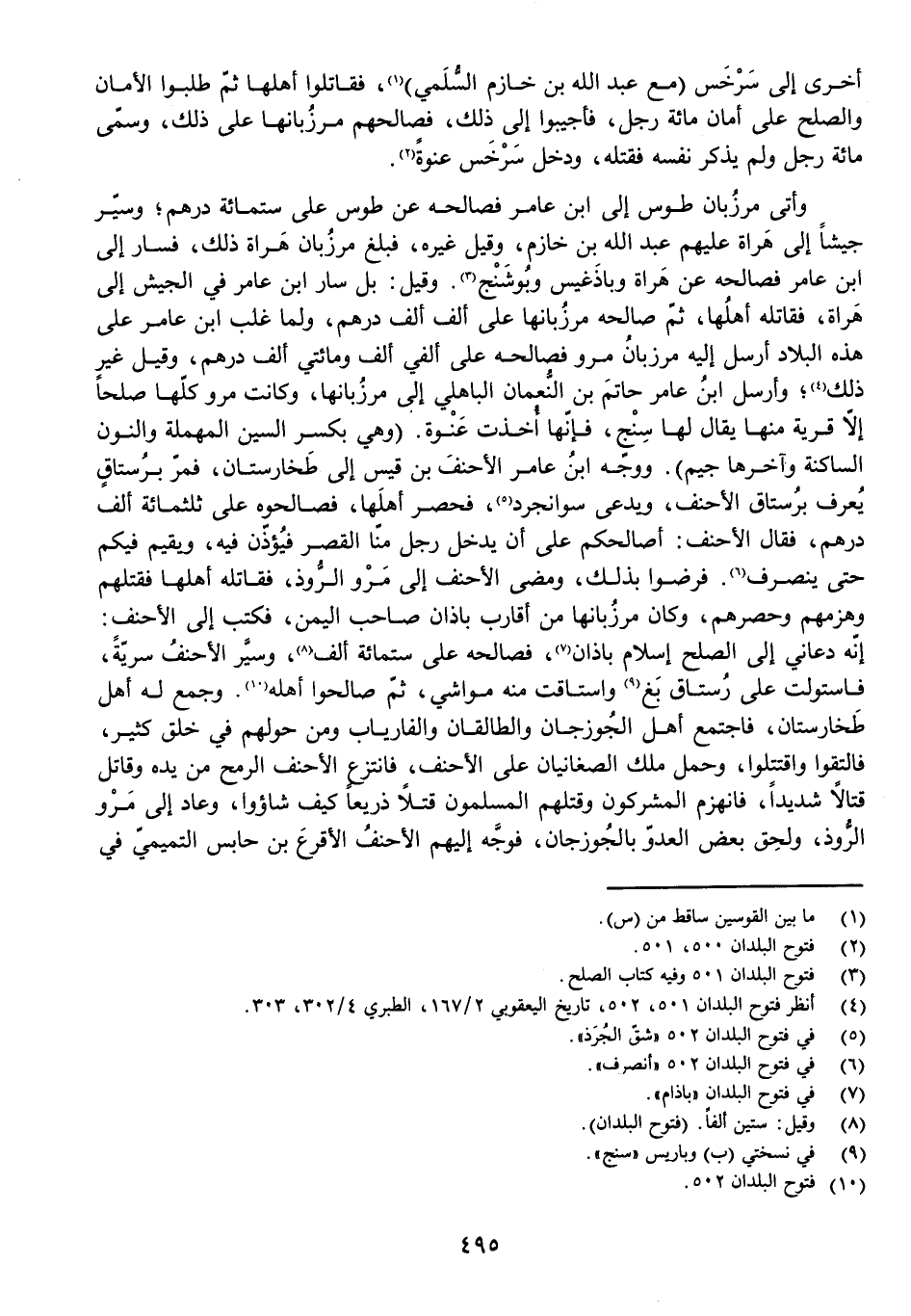 وَأَتَى مَرْزُبَانُ طُوسَ إِلَى ابْنِ عَامِرٍ فَصَالَحَهُ عَنْ طُوسَ عَلَى سِتِّمِائَةِ دِرْهَمٍ، وَسَيَّرَ جَيْشًا إِلَى هَرَاةَ عَلَيْهِمْ عَبْدُ اللَّهِ بْنُ خَازِمٍ، وَقِيلَ غَيْرُهُ، فَبَلَغَ مَرْزُبَانَ هَرَاةَ ذَلِكَ، فَسَارَ إِلَى ابْنِ عَامِرٍ فَصَالَحَهُ عَنْ هَرَاةَ وَبَاذَغِيسَ وَبُوشَنْجَ. وَقِيلَ: بَلْ سَارَ ابْنُ عَامِرٍ فِي الْجَيْشِ إِلَى هَرَاةَ، فَقَاتَلَهُ أَهْلُهَا ثُمَّ صَالَحَهُ مَرْزُبَانُهَا عَلَى أَلْفِ أَلْفِ دِرْهَمٍ، وَلَمَّا غَلَبَ ابْنُ عَامِرٍ عَلَى هَذِهِ الْبِلَادِ أَرْسَلَ إِلَيْهِ مَرْزُبَانُ مَرْوَ فَصَالَحَهُ عَلَى أَلْفَيْ أَلْفٍ وَمِائَتَيْ أَلْفِ دِرْهَمٍ، وَقِيلَ غَيْرُ ذَلِكَ، وَأَرْسَلَ ابْنُ عَامِرٍ حَاتِمَ بْنَ النُّعْمَانِ الْبَاهِلِيَّ إِلَى مَرْزُبَانِهَا، وَكَانَتْ مَرْوُ كُلُّهَا صُلْحًا إِلَّا قَرْيَةً مِنْهَا يُقَالُ لَهَا سِنْجُ، فَإِنَّهَا أُخِذَتْ عَنْوَةً (وَهِيَ بِكَسْرِ السِّينِ الْمُهْمَلَةِ وَالنُّونِ السَّاكِنَةِ وَآخِرُهَا جِيمٌ) . وَوَجَّهَ ابْنُ عَامِرٍ الْأَحْنَفَ بْنَ قَيْسٍ إِلَى طُخَارِسْتَانَ، فَمَرَّ بِرُسْتَاقٍ يُعْرَفُ بِرُسْتَاقِ الْأَحْنَفِ، وَيُدْعَى سِوَانْجَرْدَ، فَحَصَرَ أَهْلَهَا، فَصَالَحُوهُ عَلَى ثَلَاثِمِائَةِ أَلْفِ دِرْهَمٍ، فَقَالَ الْأَحْنَفُ: أُصَالِحُكُمْ عَلَى أَنْ يَدْخُلَ رَجُلٌ مِنَّا الْقَصْرَ فَيُؤَذِّنَ فِيهِ، وَيُقِيمَ فِيكُمْ حَتَّى يَنْصَرِفَ. فَرَضُوا بِذَلِكَ، وَمَضَى الْأَحْنَفُ إِلَى مَرْوِ الرُّوَذِ فَقَاتَلَهُ أَهْلُهَا فَقَتَلَهُمْ وَهَزَمَهُمْ وَحَصَرَهُمْ، وَكَانَ مَرْزُبَانُهَا مِنْ أَقَارِبِ بَاذَانَ صَاحِبِ الْيَمَنِ، فَكَتَبَ إِلَى الْأَحْنَفِ: إِنَّهُ دَعَانِي إِلَى الصُّلْحِ إِسْلَامُ بَاذَانَ، فَصَالَحَهُ عَلَى سِتِّمِائَةِ أَلْفٍ، وَسَيَّرَ الْأَحْنَفَ سَرِيَّةً، فَاسْتَوْلَتْ عَلَى رُسْتَاقِ بَغَ وَاسْتَاقَتْ مِنْهُ مَوَاشِيَ، ثُمَّ صَالَحُوا أَهْلَهُ. وَجُمِعَ لَهُ أَهْلُ طُخَارِسْتَانَ، فَاجْتَمَعَ أَهْلُ الْجُوزَجَانِ وَالطَّالَقَانِ وَالْفَارِيَابِ وَمَنْ حَوْلَهُمْ فِي خَلْقٍ كَثِيرٍ، فَالْتَقَوْا وَاقْتَتَلُوا، وَحَمَلَ مَلِكُ الصَّغَانِيَانِ عَلَى الْأَحْنَفِ، فَانْتَزَعَ الْأَحْنَفُ الرُّمْحَ مِنْ يَدِهِ وَقَاتَلَ قِتَالًا شَدِيدًا، فَانْهَزَمَ الْمُشْرِكُونَ وَقَتَلَهُمُ الْمُسْلِمُونَ قَتْلًا ذَرِيعًا كَيْفَ شَاءُوا، وَعَادَ إِلَى مَرْوِ الرُّوَذِ، وَلَحِقَ بَعْضُ الْعَدُوِّ بِالْجُوزَجَانِ، فَوَجَّهَ إِلَيْهِمُ الْأَحْنَفُ الْأَقْرَعَ بْنَ حَابِسٍ التَّمِيمِيَّ فِي
