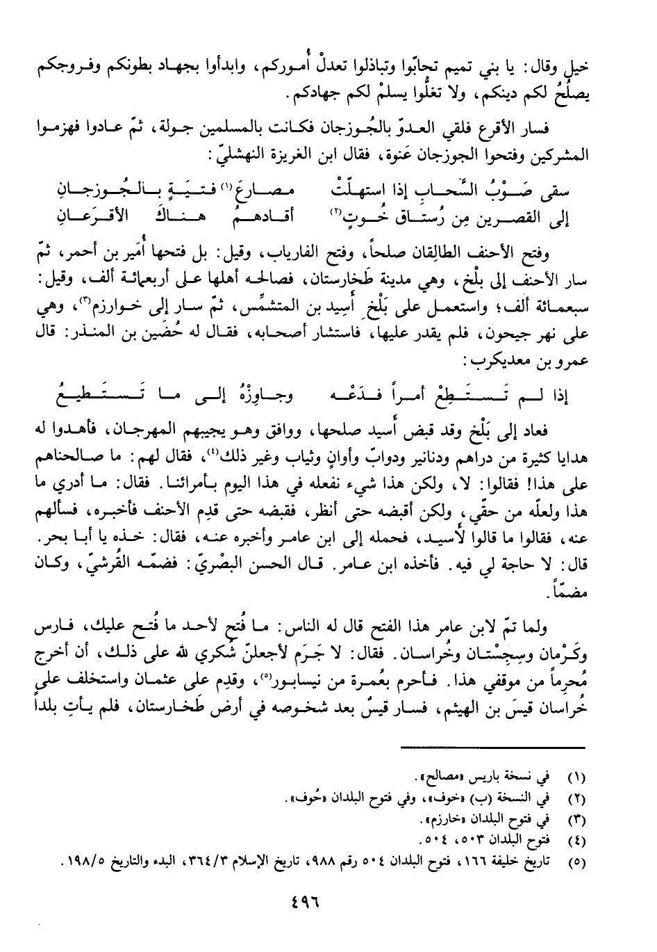 وَفَتَحَ الْأَحْنَفُ الطَّالَقَانَ صُلْحًا، وَفَتَحَ الْفَارِيَابَ، وَقِيلَ: بَلْ فَتَحَهَا أُمَيْرُ بْنُ أَحْمَرَ، ثُمَّ سَارَ الْأَحْنَفُ إِلَى بَلْخَ، وَهِيَ مَدِينَةُ طُخَارِسْتَانَ، فَصَالَحَهُ أَهْلُهَا عَلَى أَرْبَعِمِائَةِ أَلْفٍ، وَقِيلَ: سَبْعِمِائَةِ أَلْفٍ، وَاسْتَعْمَلَ عَلَى بَلْخَ أَسِيدَ بْنَ الْمُتَشَمِّسِ، ثُمَّ سَارَ إِلَى خَوَارِزْمَ، وَهِيَ عَلَى نَهْرِ جَيْحُونَ، فَلَمْ يَقْدِرْ عَلَيْهَا، فَاسْتَشَارَ أَصْحَابَهُ، فَقَالَ لَهُ حُضَيْنُ بْنُ الْمُنْذِرِ: قَالَ عَمْرُو بْنُ مَعْدِ يكَرِبَ: